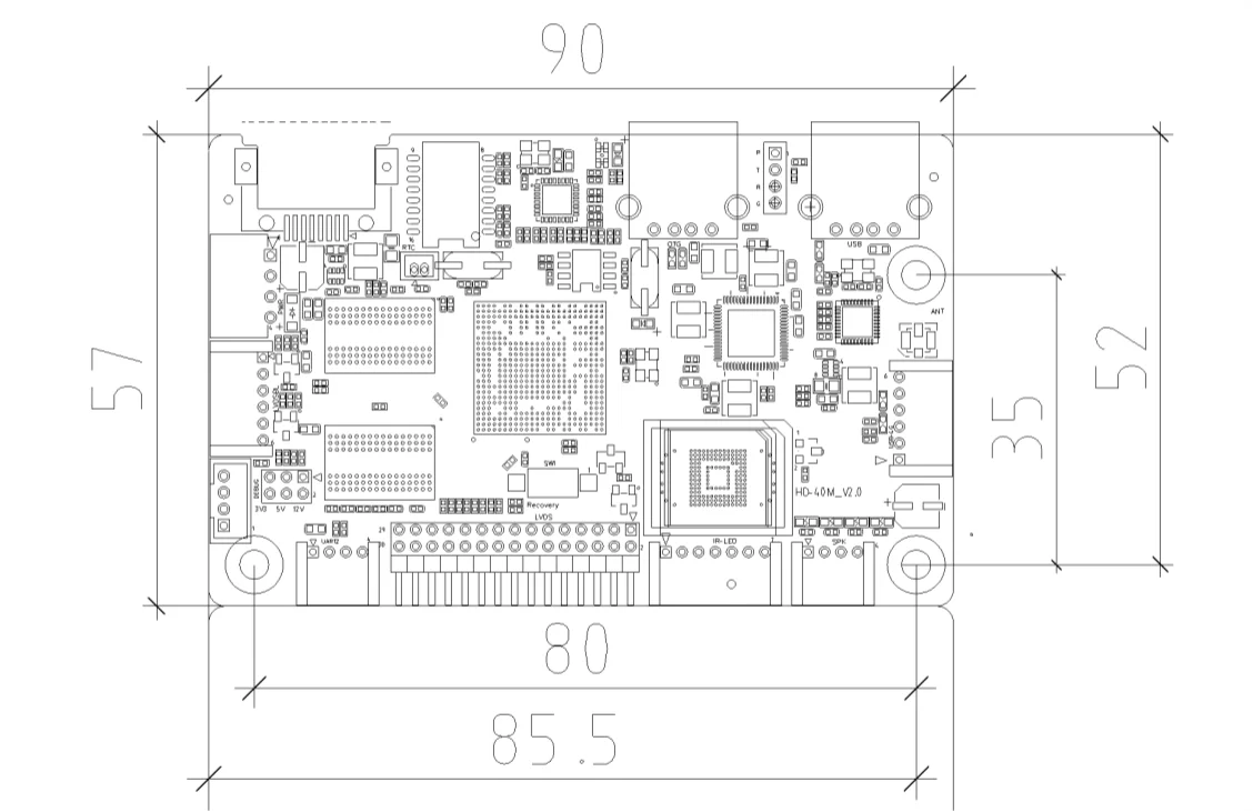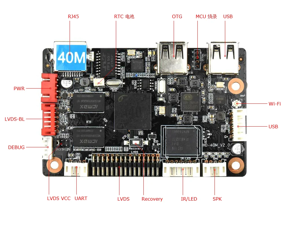 ● De la integración La placa todo en uno Android A40i integra Ethernet, Wi-Fi, amplificador de potencia, puerto de expansión USB, función de control remoto IR, LVDS, control de retroiluminación, micrófono y otras funciones, lo que simplifica en gran medida el diseño de toda la máquina.