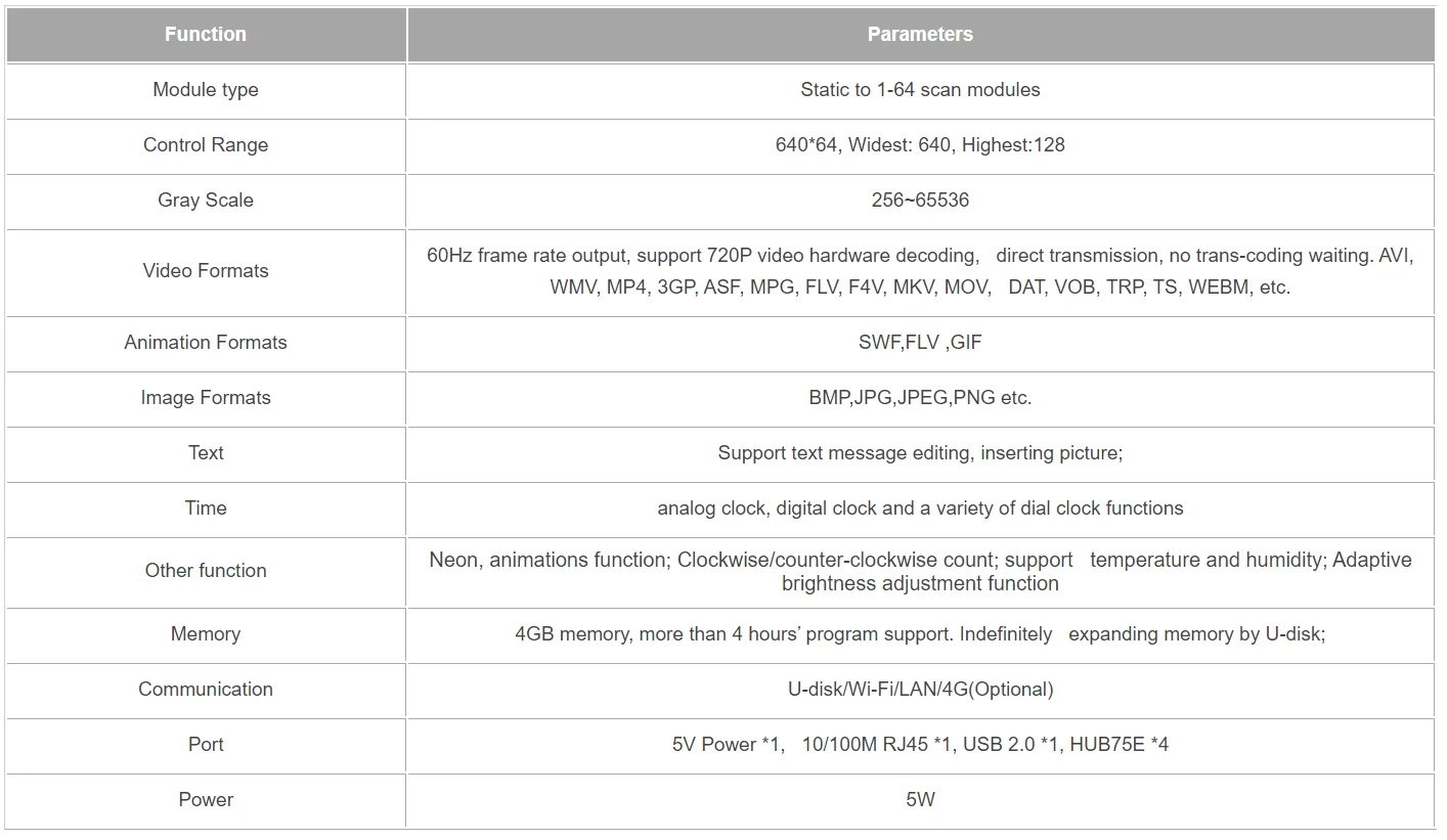 La tarjeta de control de video más pequeña para pantallas LED a todo color, la capacidad de carga máxima es de 40.960 píxeles, la más ancha es de 640 píxeles, la más alta es de 128 píxeles, viene con módulo Wi-Fi, gestión inalámbrica de aplicaciones móviles, puede admitir módulo 4G opcional, control de clúster remoto de Internet, Se utiliza ampliamente para pantallas LED de dintel, pantallas de coche y pantallas LED de tamaño pequeño a todo color.