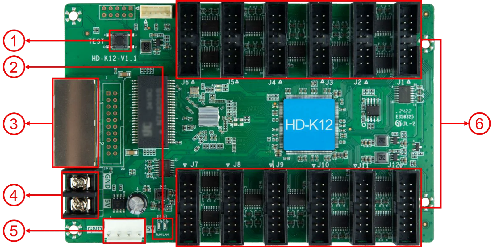 K12 is an LED display receiving card that supports both synchronous control system and asynchronous control system. It does not require an adapter board. It has 12 standard HUB75E interfaces on the board and has good stability. It supports 24 sets of RGB parallel data.