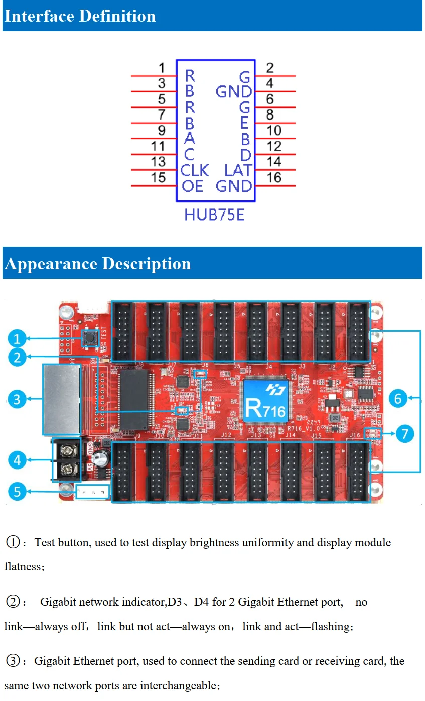 R716 a bordo 16 * puertos HUB75E, compatible con R500/R508/R512/R512S/ R512T/R516/ R516T/R612, etc..