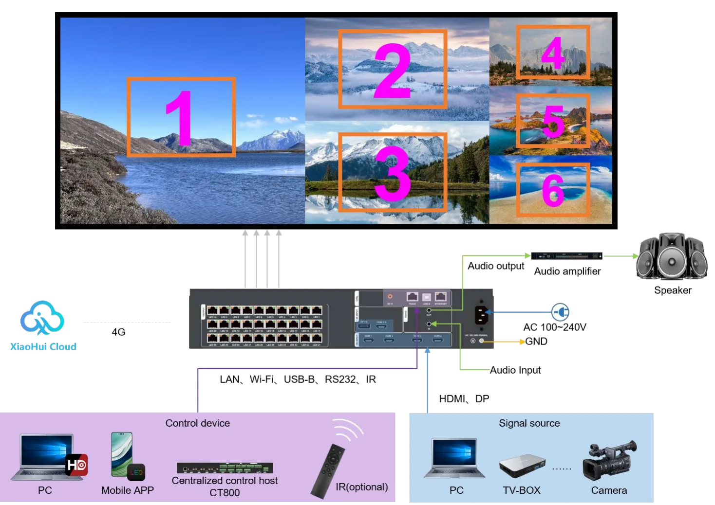 Admite el diseño gratuito de seis pantallas y admite un máximo de ventanas 3×4K o 2×4K+4×2K;