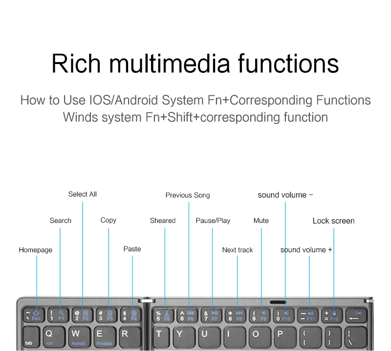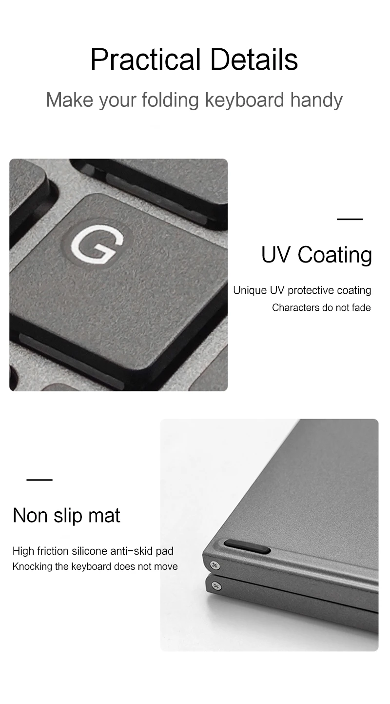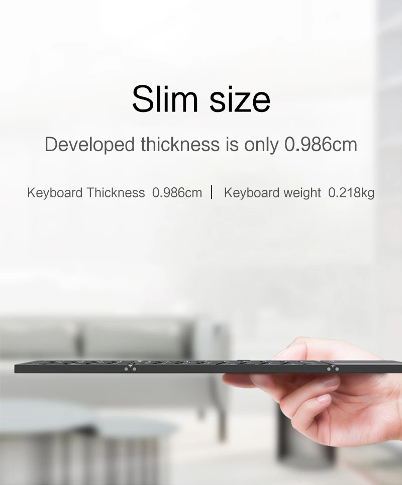 Tamaño del teclado: despliegue 304,31x98,12x9,86 mm/11,9*3,85*0,38 pulgadas, plegado: 152 x 98,12x19,83 mm/6x3,85 x 0,8 pulgadas