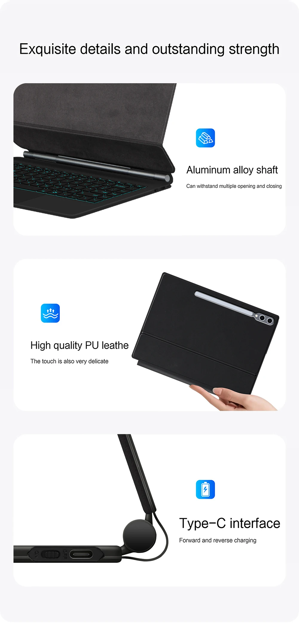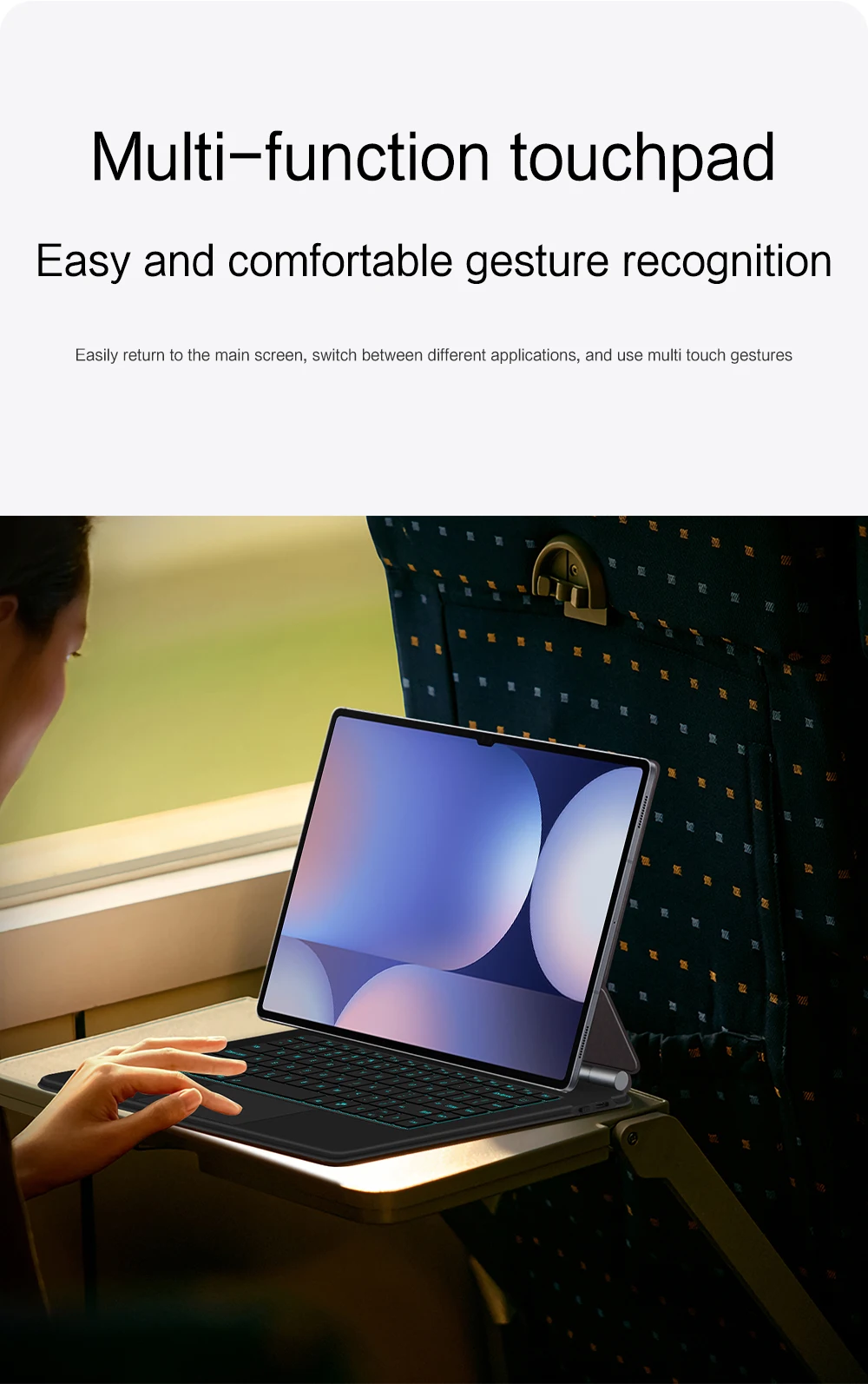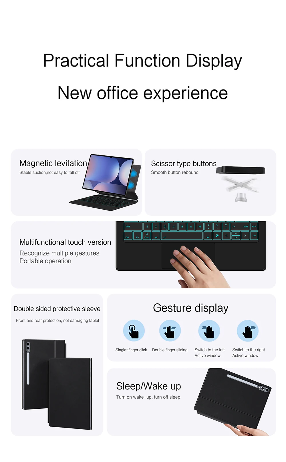 Separación magnética, retroiluminación, panel táctil, soporte multiángulo, Bluetooth inalámbrico