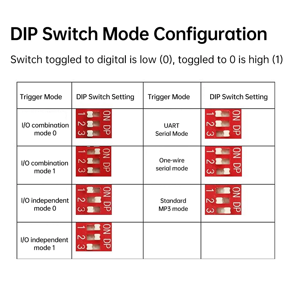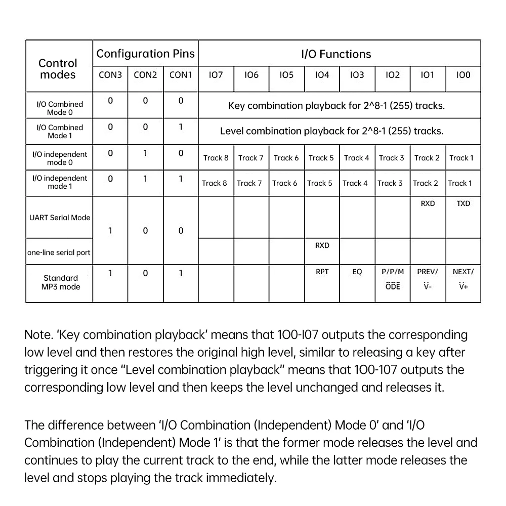 El puerto serie UART controla la función de transmisión de voz, que puede controlar la reproducción, pausa, selección de canciones, ajuste de volumen y otras funciones.El número máximo de canciones seleccionadas es 65535, y la velocidad en baudios es 9600 bits/s.