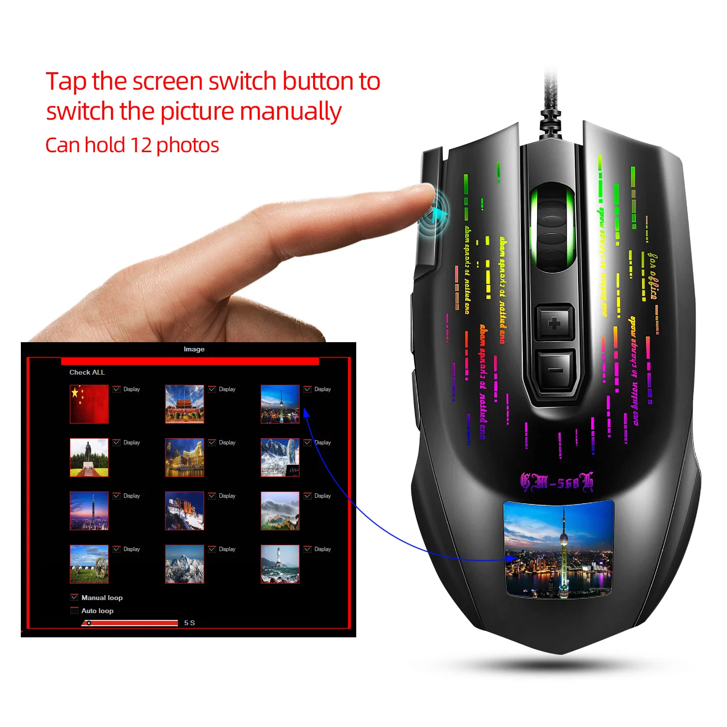 1: Configuración de foto personalizada, puede acomodar 12 fotos, puede hacer clic en el botón de cambio de pantalla para cambiar manualmente la imagen.