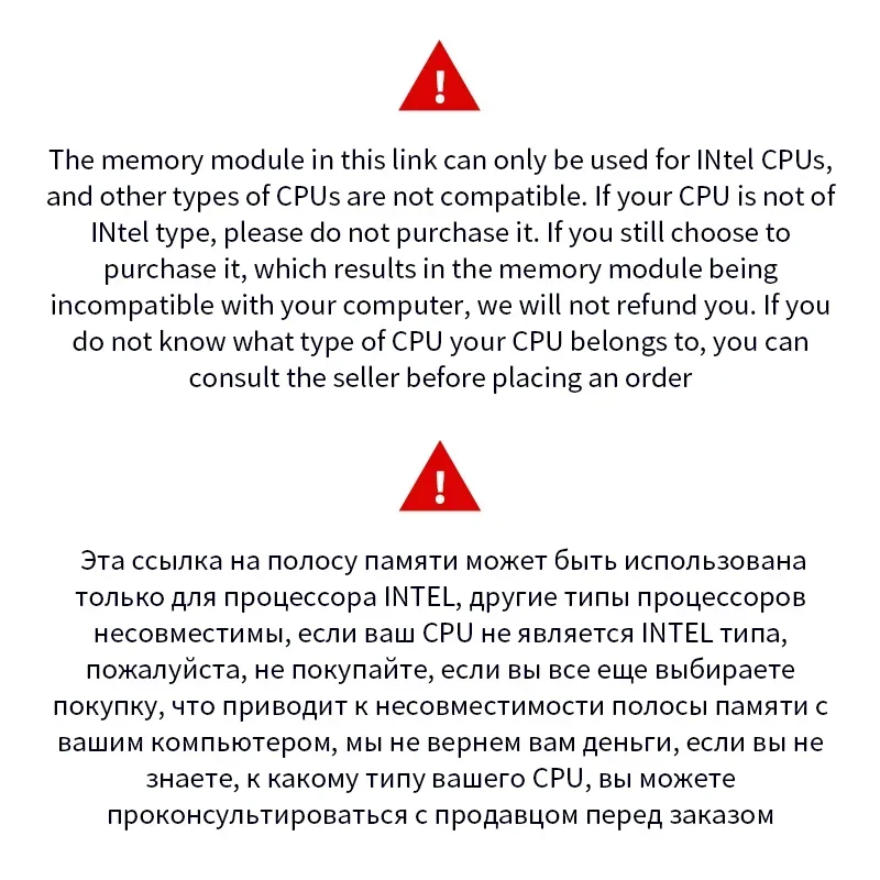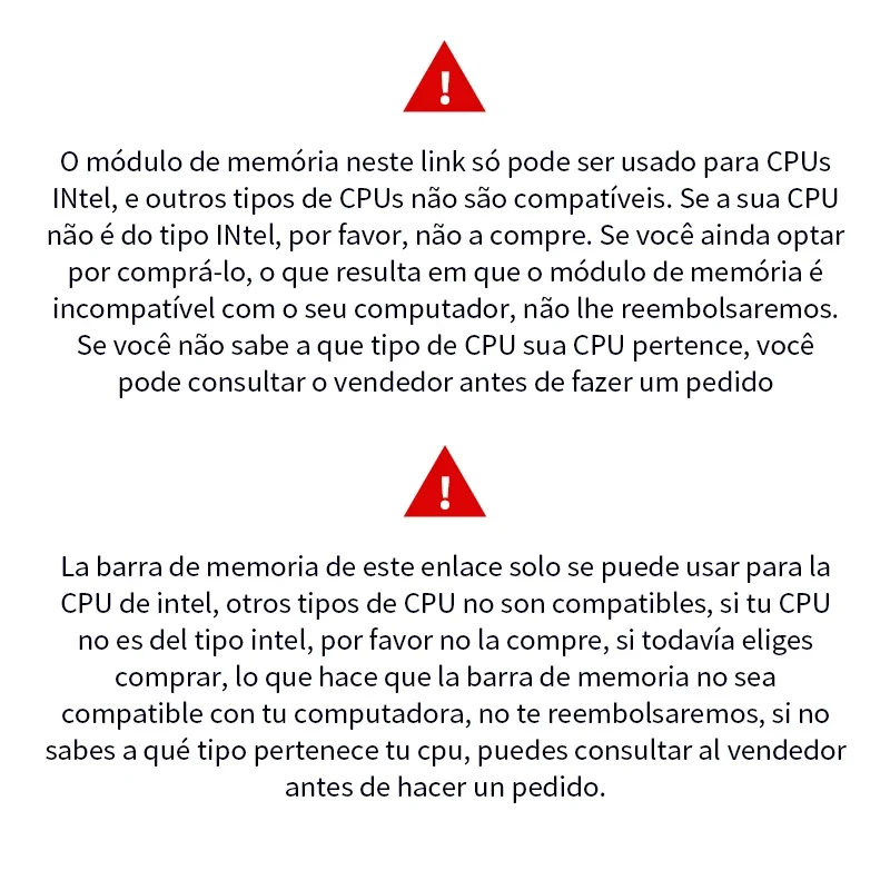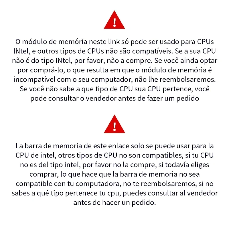* El módulo de memoria en este enlace solo se puede usar para CPU lNtel, y otros tipos de CPU no son compatibles. Si su CPU no es de tipo Intel, no la compre. Si aún así eliges comprarlo, lo que hace que el módulo de memoria sea incompatible con tu ordenador, no te reembolsaremos. Si no sabe a qué tipo de CPU pertenece su CPU, puede consultar al vendedor antes de realizar un pedido