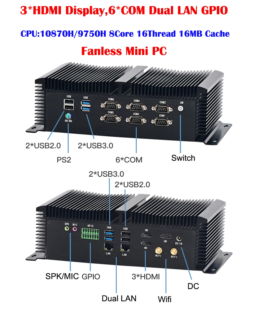 Comprar I7 10750H i5 10200H Industrial Fanless Mini 6 * COM 3 * HDMI Dispaly 2 * LAN GPIO 8Core 16Thread 16Mb caché computadora de escritorio Windows11