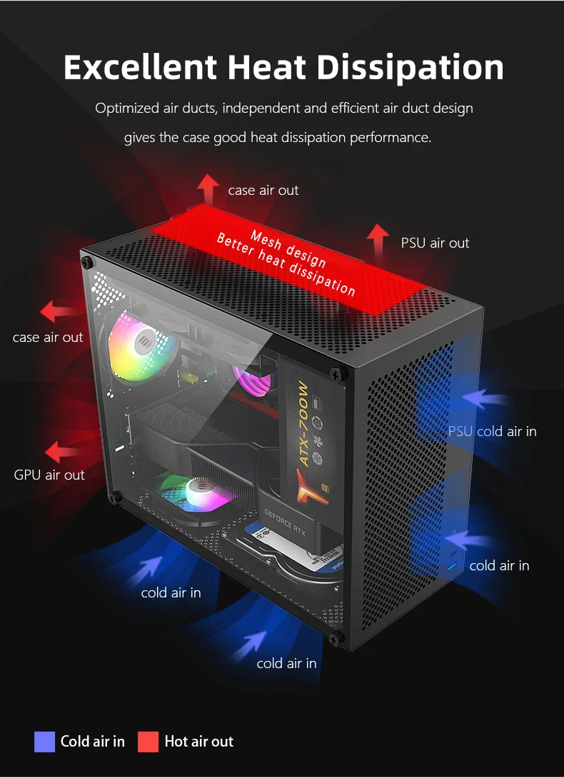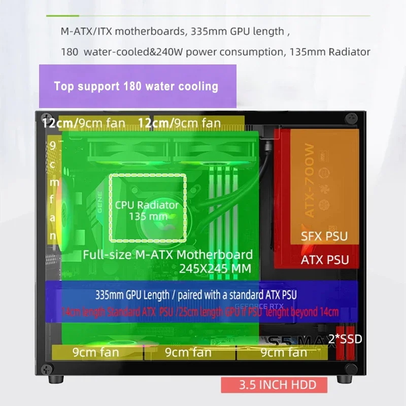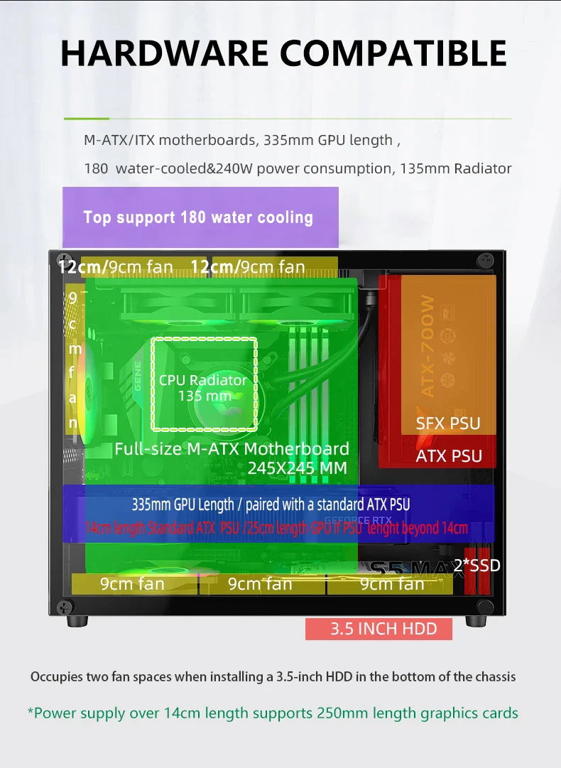 Compatibilidad con HDD: HDD de 3,5 pulgadas * 1 (obstran 2 espacios de ventilador en la parte inferior), SSD de 2,5 pulgadas * 2