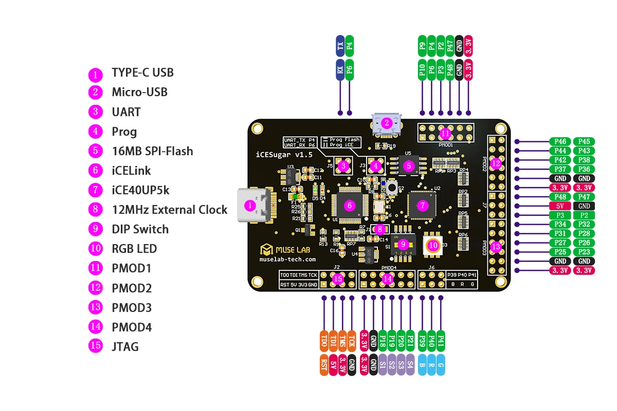 ICESugar ist eine open source FPGA entwicklung board basierend auf Gitter iCE40UP5k entworfen und von Muse Labor. Obwohl es der kleine und exquisite, es enthält reiche peripheren ressourcen an bord einschließlich RGB LED, Schalter, TYPE-C-USB, Micro-USB. Die meisten der IO sind led-out durch standard PMOD stecker und können verbinden sie mit anderen PMOD gerät. Auch, es hat eine auf-board debugger genannt iCELink, basierend auf ARM Mbed DAPLink. Sie können nur drag die FPGA bitstream in die virtuelle disk zu programm mit eine große bequemlichkeit, seit die iCELink unterstützt drag-und-drop programmierung, USB CDC serial port und JTAG.