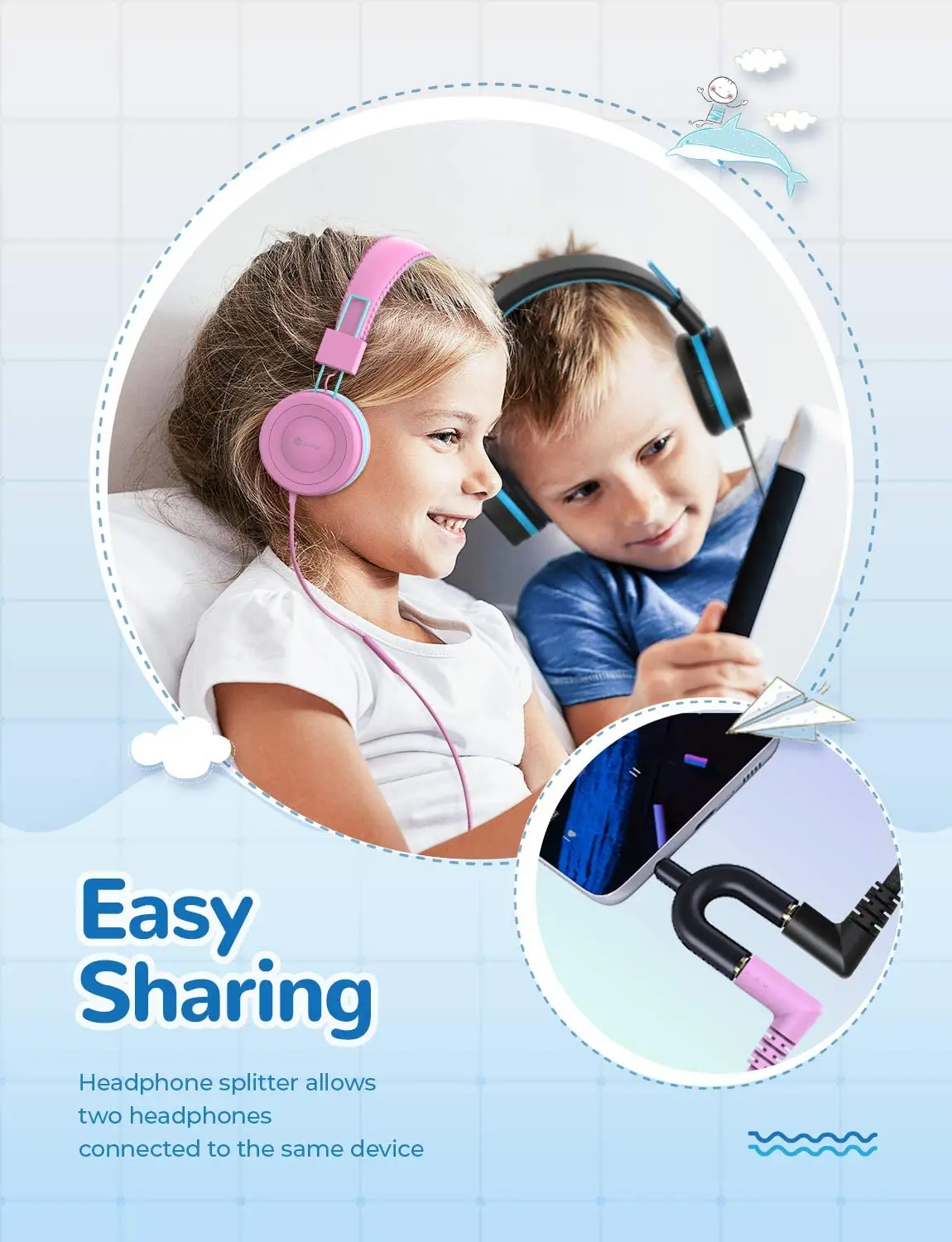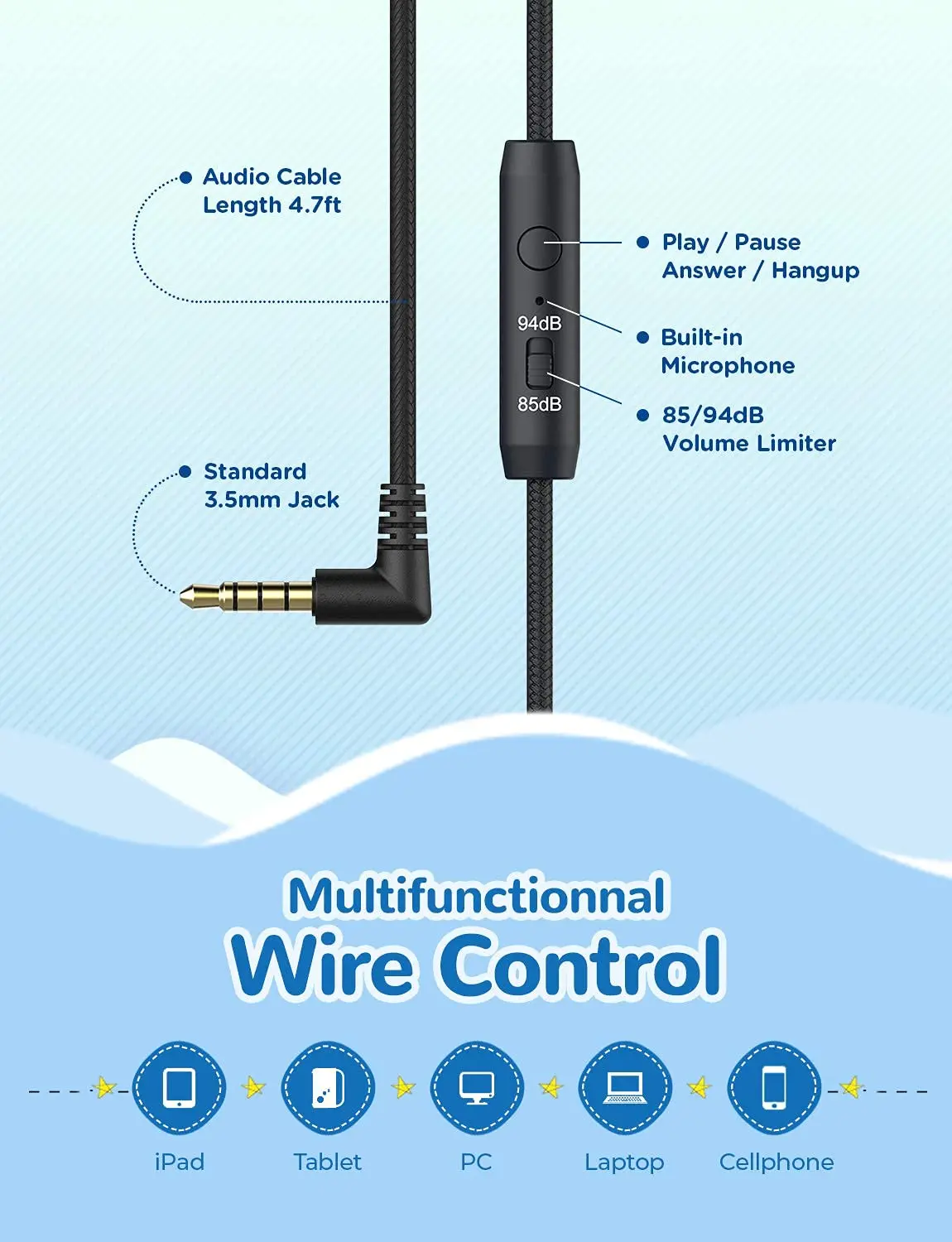 Reproduce, pausa, responde y finaliza llamadas con solo tocar un botón. El micrófono incorporado de los auriculares para Niños proporciona control manos libres y fácil operación. Funciona con prácticamente todos los teléfonos inteligentes, tabletas, como iPhone, teléfonos móviles Android, tabletas y más.