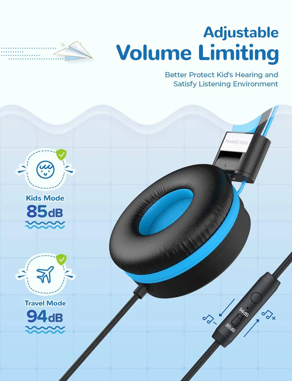 Los oídos de los niños son vulnerables al daño por sonido, por lo tanto, elija el limitador de volumen de 85dB para uso diario. Si el niño está en un ambiente ruidoso, o un avión como un coche, ajuste el limitador a 94dB para un sonido nítido.