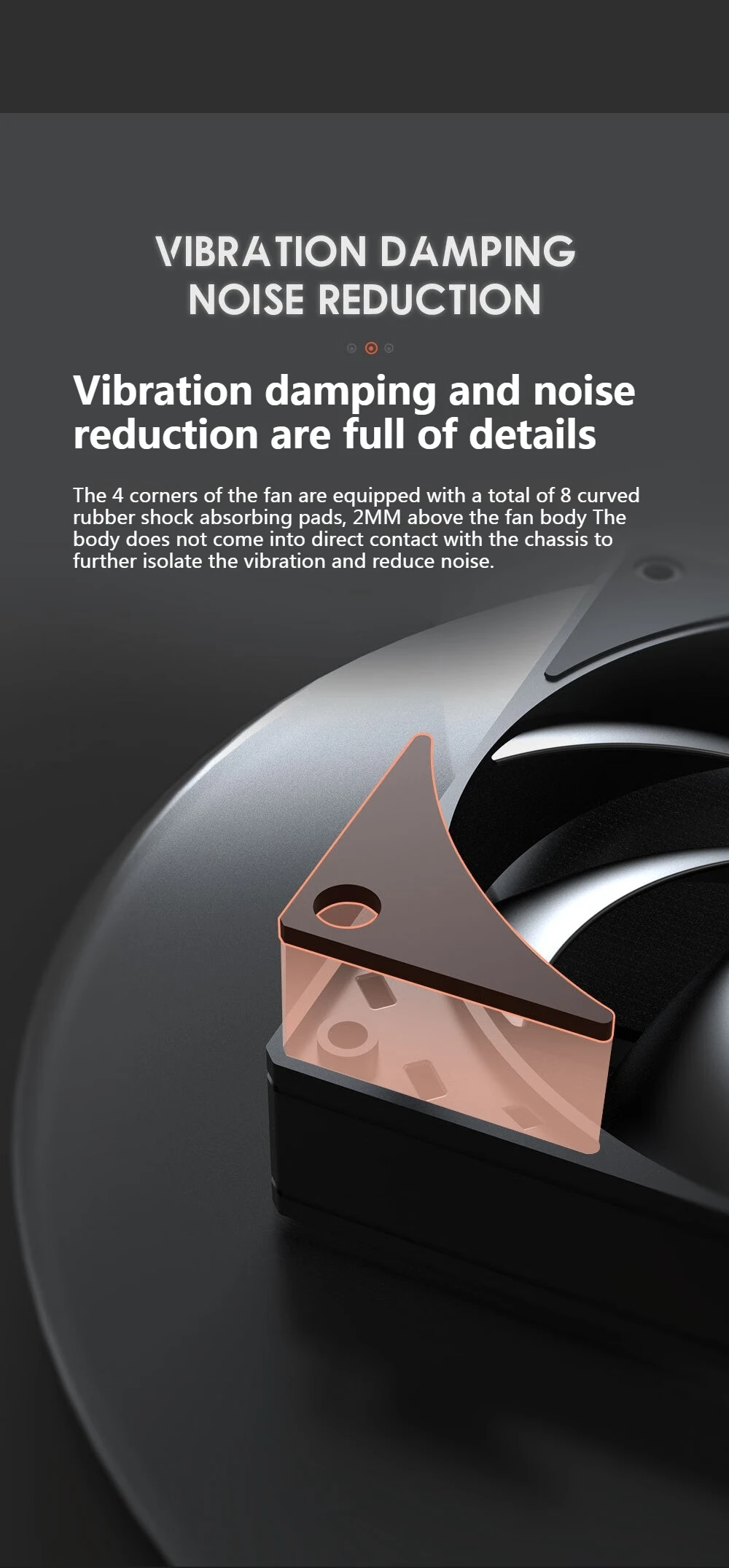 Un total de 8 almohadillas amortiguadoras de goma curvas están instaladas en las 4 esquinas del ventilador, que son 2mm más altas que el cuerpo del ventilador. El cuerpo no está en contacto directo con el chasis, aislando aún más la vibración y reduciendo el ruido.