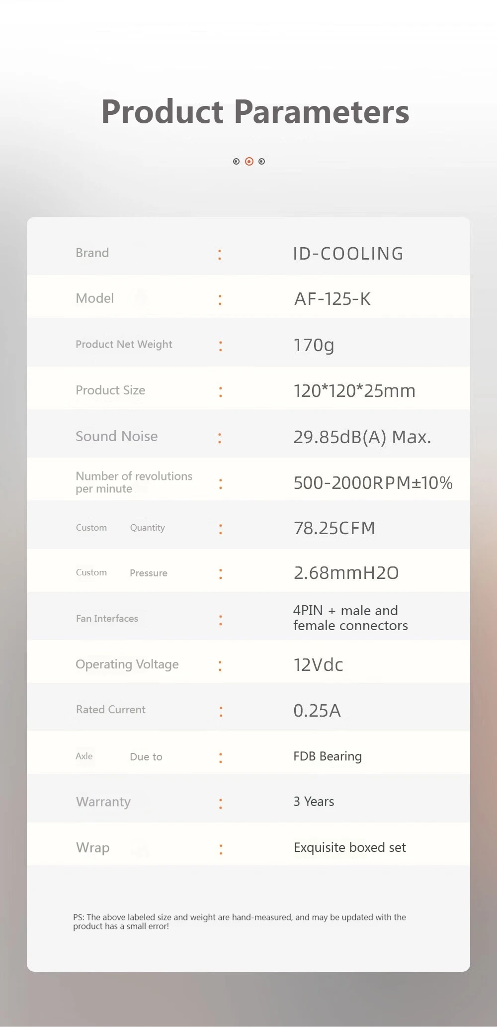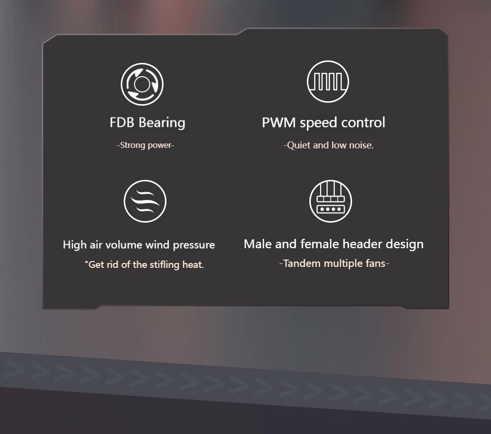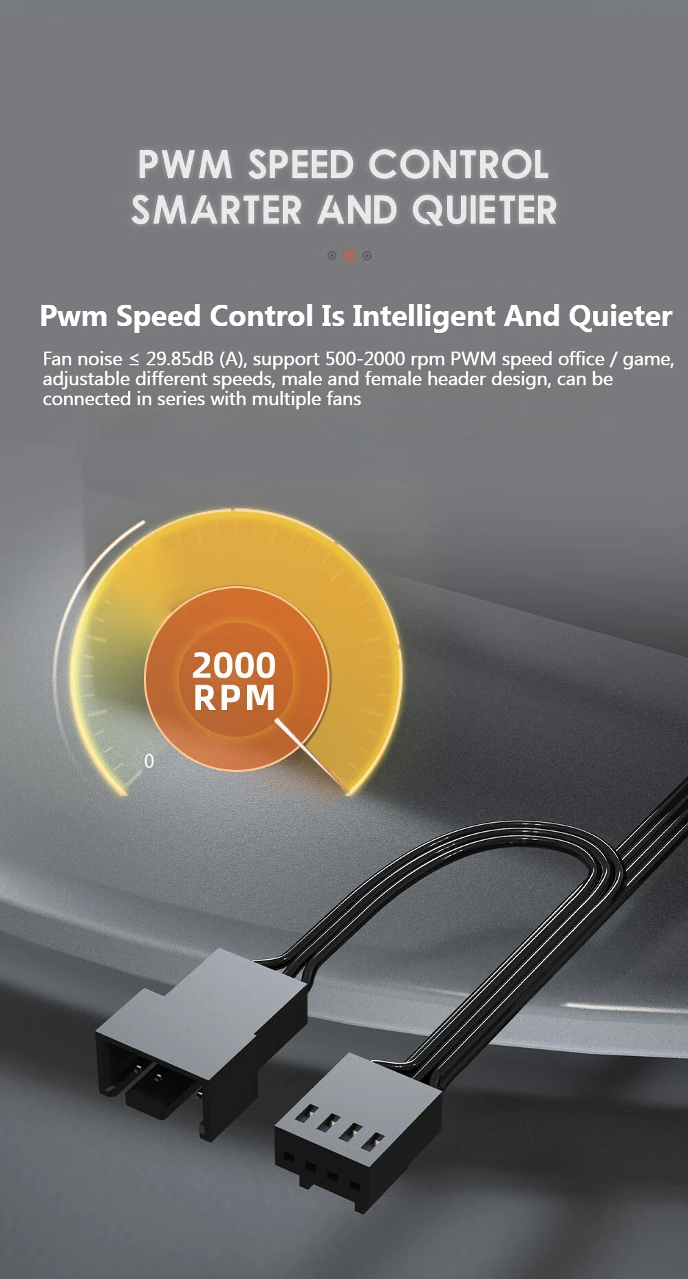 Ruido del ventilador ≤ 29.85dB(A), admite ajuste de velocidad PwM de 500-2000 rpm, oficina/juego, ajustables diferentes velocidades, diseño de cabeza macho y hembra, se pueden conectar múltiples ventiladores en serie