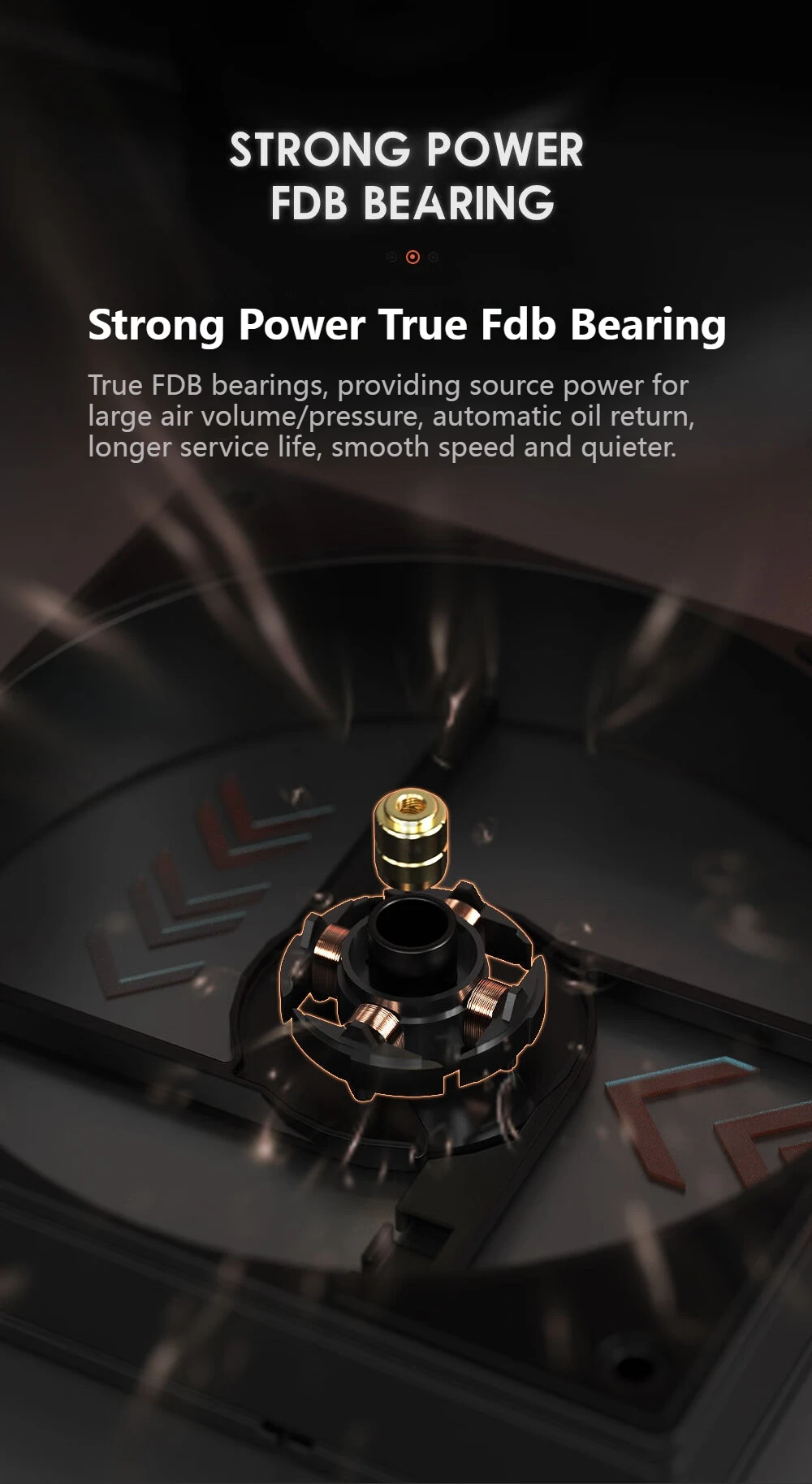 Los verdaderos rodamientos FDB proporcionan energía para un gran volumen de aire/presión del viento, retorno automático de aceite, mayor vida útil, velocidad estable y más silencioso