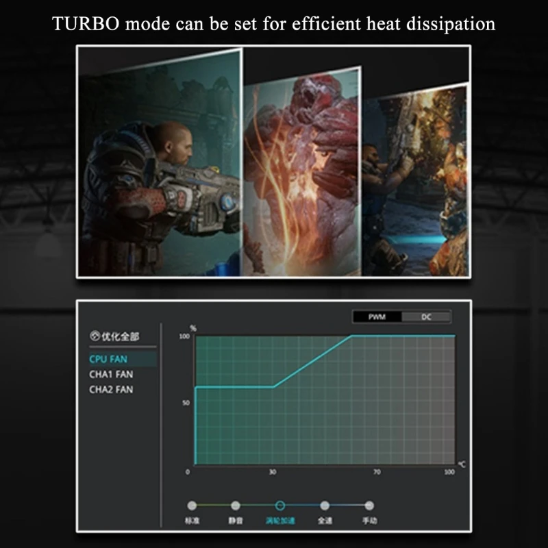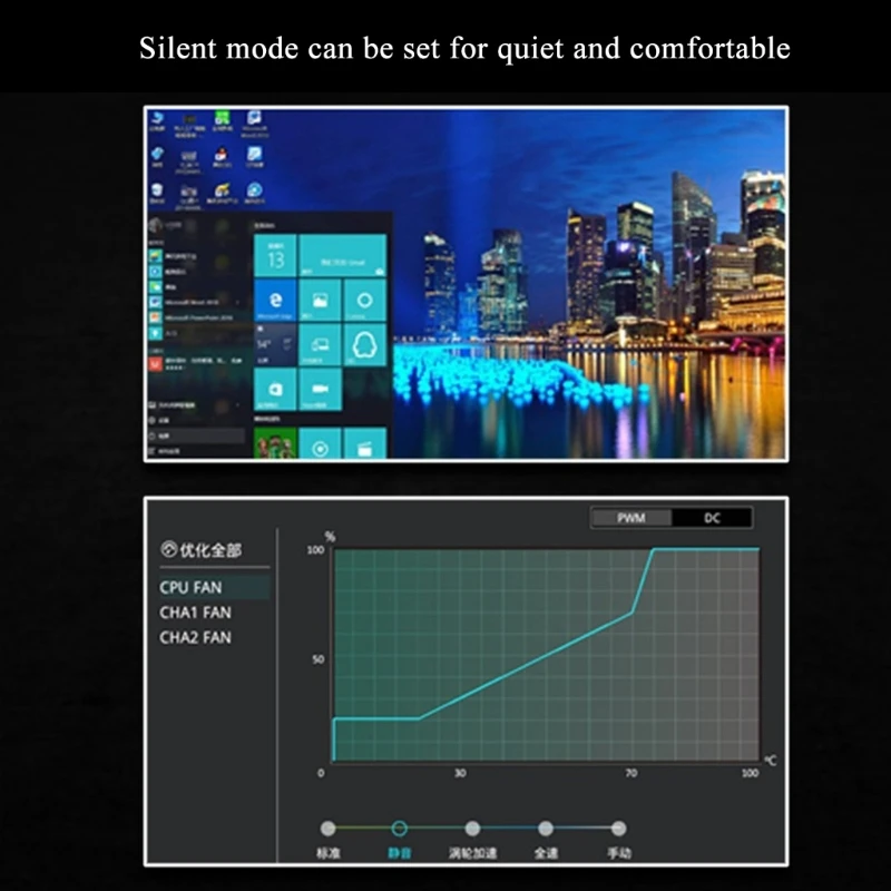 Ventilador PWM: El control del ventilador PWM permite un ajuste dinámico de la velocidad entre 2 000 minimizando el ruido o maximizando 54,6 CFM; Ruido: 13,8 ~ 31,2 dB(A)