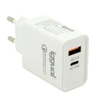 Carga hasta dos dispositivos móviles de manera simultánea con el cargador rápido de pared USB QC3.0 + PD de 20W de iggual.