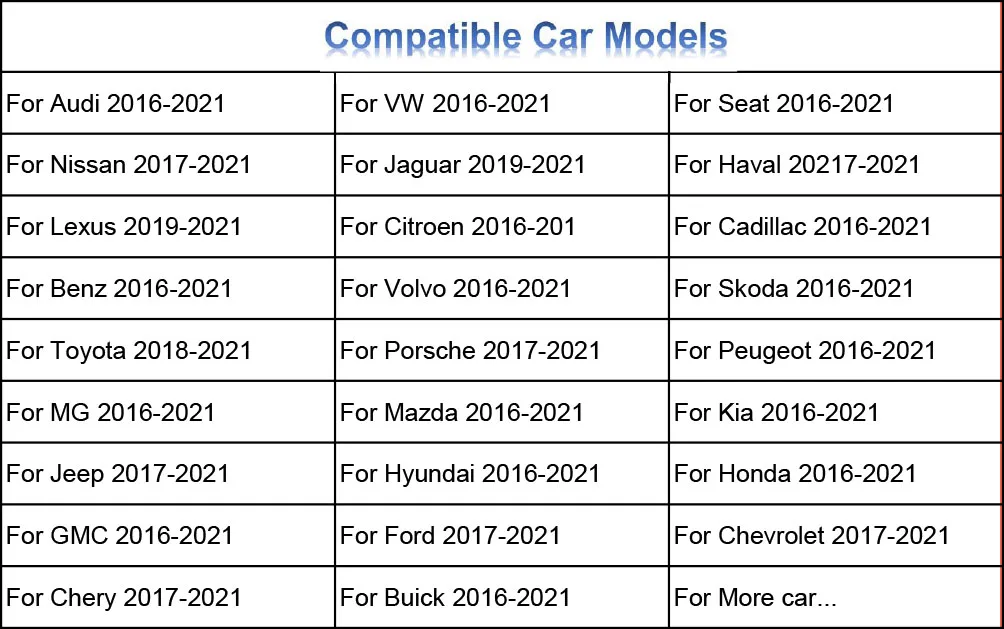 Tiene una lista de automóviles compatible con la siguiente imagen, tómelo como referencia, si no está seguro de si su automóvil es compatible, contáctenos de forma gratuita, le responderemos pronto.