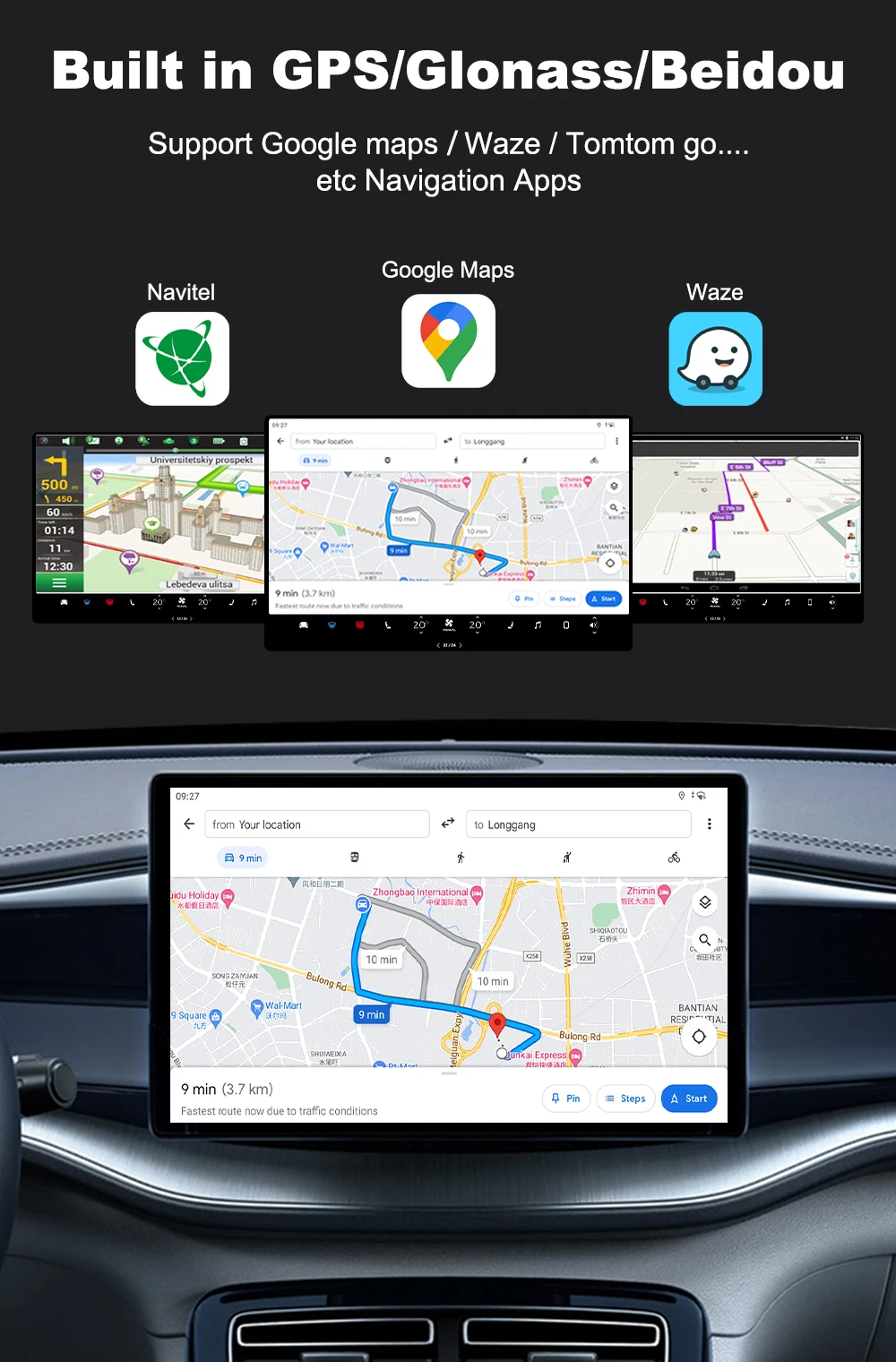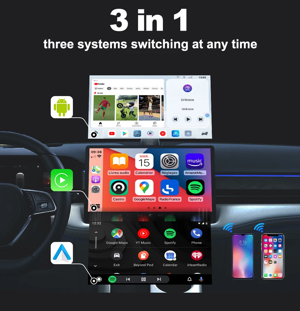 Función: CarPlay inalámbrico/descargar aplicaciones/pantalla dividida/modo Día y noche/Mirrorlink/llamada telefónica Bluetooth/GPS incorporado/soporte SIM/tarjeta TF/Android Auto inalámbrico