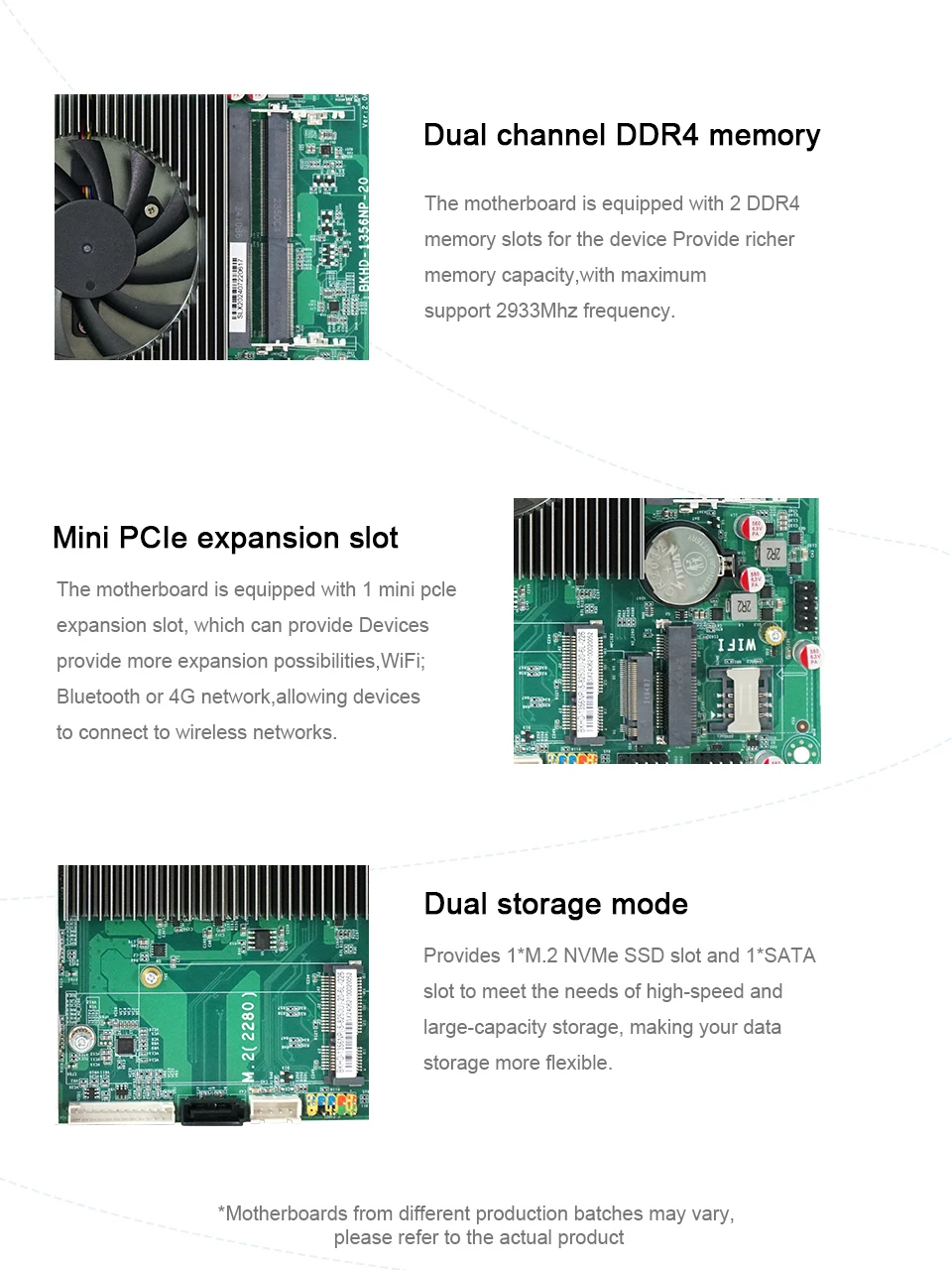 Ranura de expansión: con 1 * ranura mPCIe de media altura y 1 * ranura mPCIe de altura completa, se pueden agregar más módulos de red inalámbrica, como WiFi, BT, 4G, etc. proporcionando métodos flexibles de acceso a la red para satisfacer las necesidades de red en diferentes entornos.