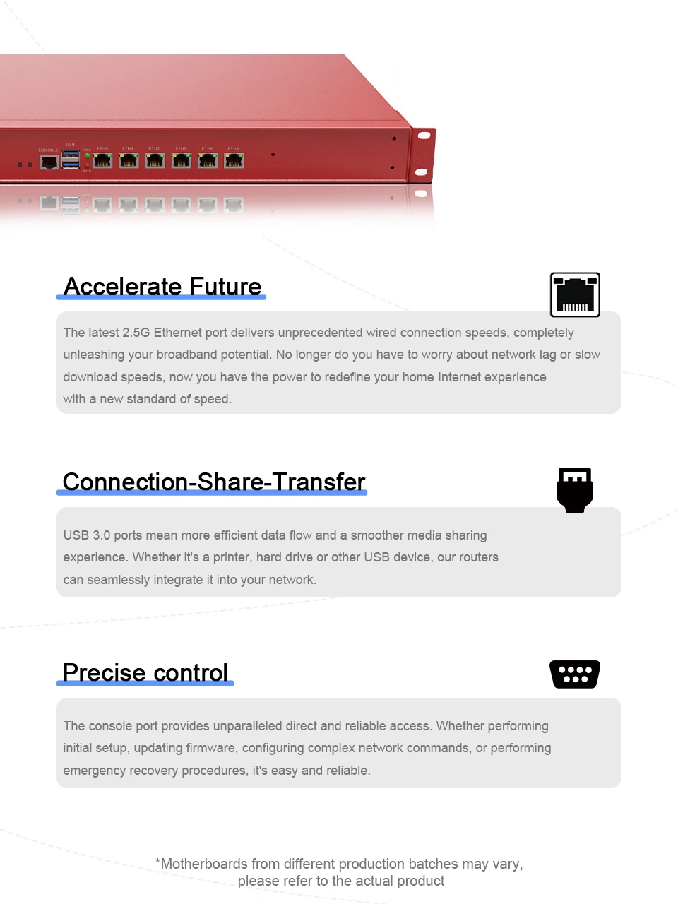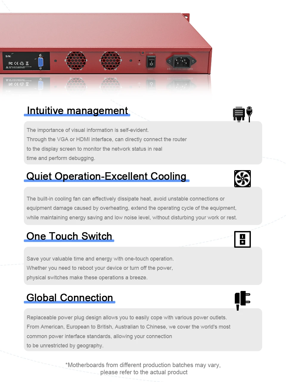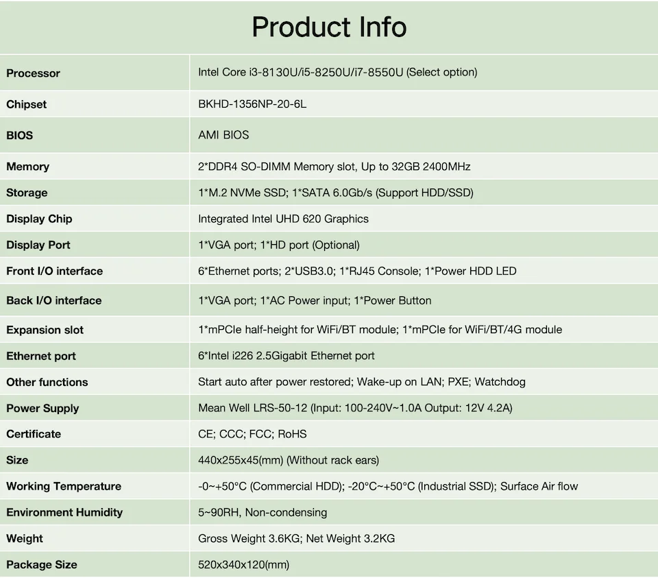 Con un rendimiento de procesamiento excelente y potente, una amplia gama de interfaces de red de alta velocidad y ranuras de expansión flexibles, garantiza que pueda satisfacer las necesidades de varias cargas altas, aplicaciones de red de ancho de banda. Tanto si se utiliza para la gestión de redes empresariales, la transferencia eficiente de datos o las comunicaciones industriales, puede proporcionar soluciones fiables y eficientes.