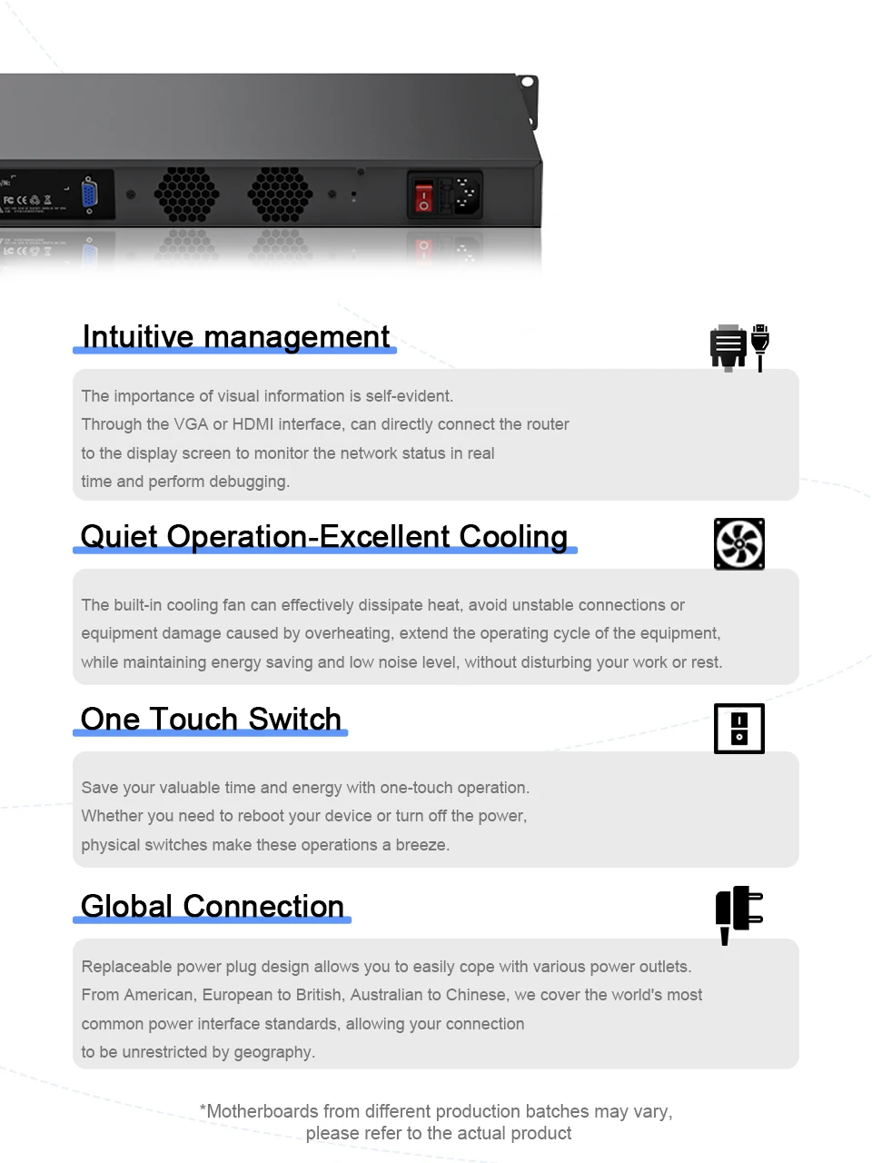 El diseño de arquitectura X86 y la excelente compatibilidad pueden admitir ampliamente varios sistemas operativos y software. Ya sea que utilice varios sistemas de enrutamiento como OPNsense, Pfsense, MikrotikOS, VyOS o la gama de escritorios y servidores de Windows, pueden cumplir fácilmente los requisitos de su entorno de trabajo.