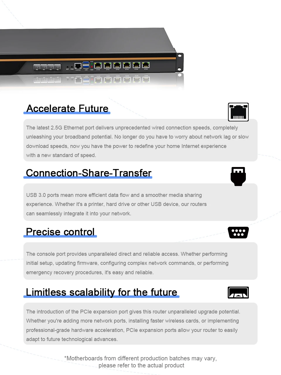 Equipado con 6 puertos Ethernet 2,5G y 4*10G SFP +/4*25G SFP28 opcional. Utilizando la tecnología de tarjeta de red adaptativa de Intel, proporciona un excelente soporte para la transmisión de datos de red de alta velocidad. Puede satisfacer las necesidades de varios escenarios, como redes domésticas de alta velocidad y redes de nivel empresarial, y puede conectar fácilmente varios dispositivos para lograr una transmisión de datos rápida y estable.