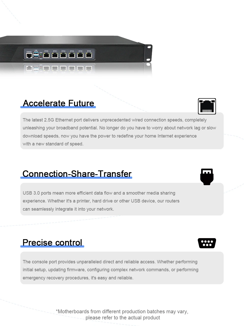 Equipado con 6 puertos Ethernet de 2,5G y utilizando la tecnología de tarjeta de red adaptativa de Intel para proporcionar un excelente soporte para la transmisión de datos de red de alta velocidad. Puede satisfacer las necesidades de varios escenarios, como redes domésticas de alta velocidad y redes de nivel empresarial, y puede conectar fácilmente varios dispositivos para lograr una transmisión de datos rápida y estable.