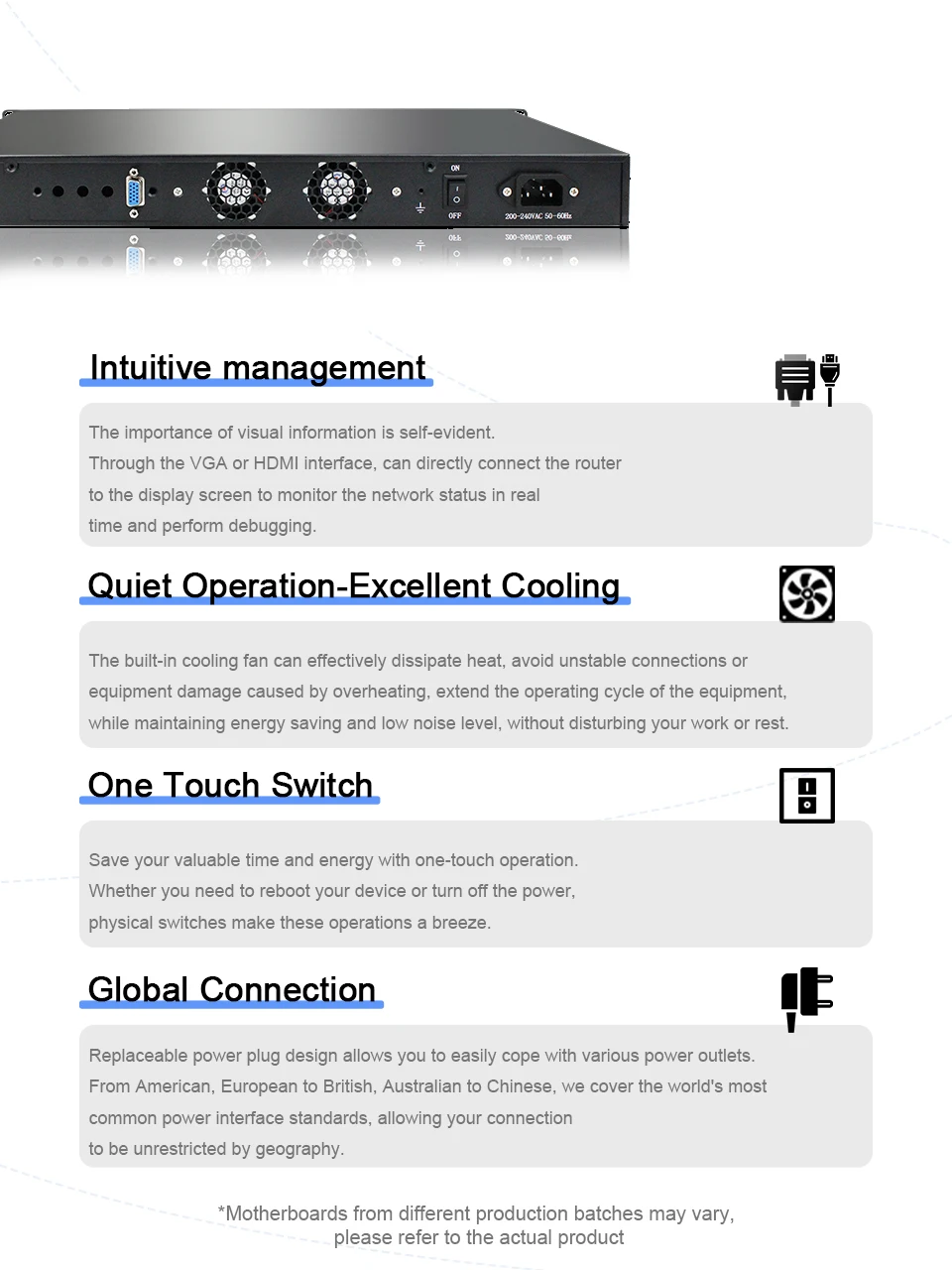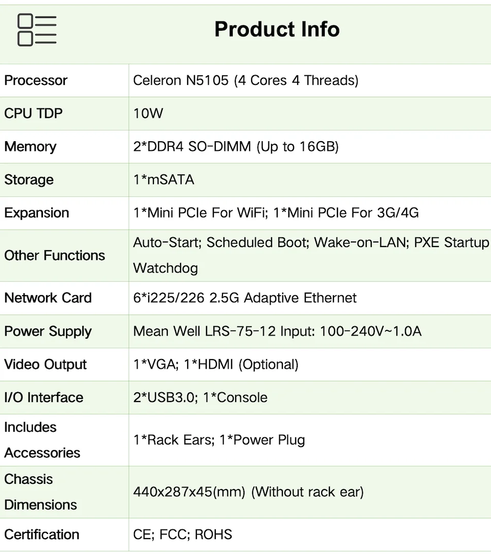 El diseño de arquitectura X86 y la excelente compatibilidad pueden admitir ampliamente varios sistemas operativos y software. Ya sea que utilice varios sistemas de enrutamiento como OPNsense, Pfsense, MikrotikOS, VyOS o la gama de escritorios y servidores de Windows, pueden cumplir fácilmente los requisitos de su entorno de trabajo.