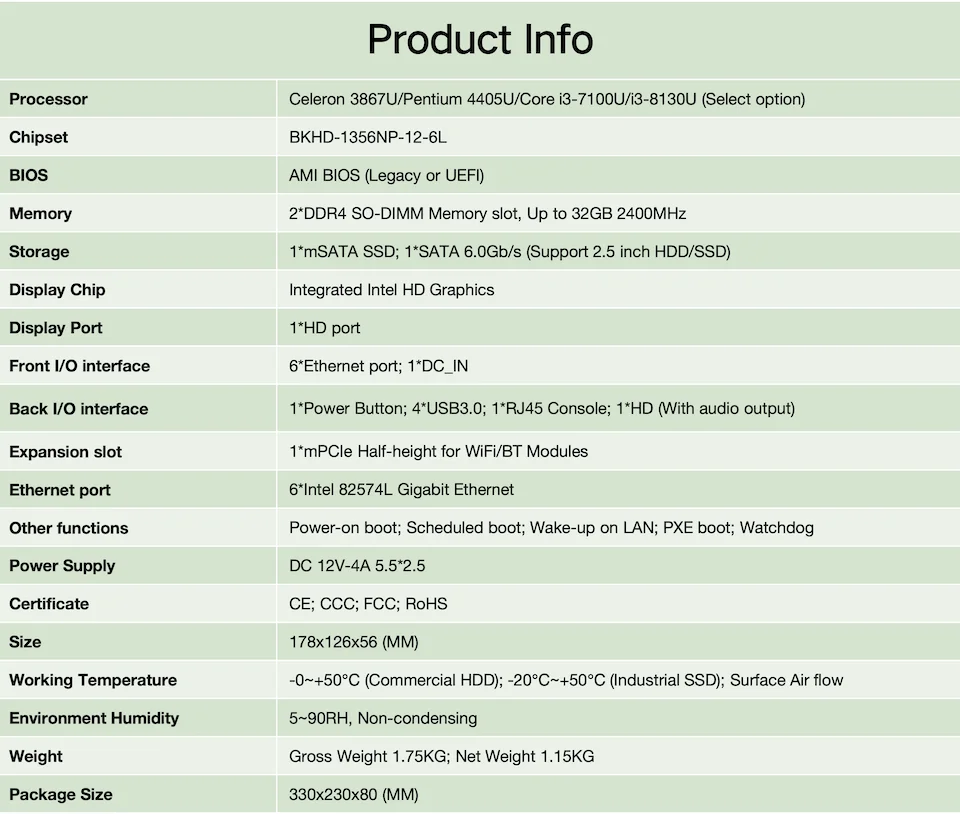 El BKHD G31 Grey 1356 6L es un dispositivo de red de alto rendimiento que puede satisfacer las necesidades de una amplia gama de escenarios de aplicaciones, desde equipos de red, servidores de pequeñas empresas, control industrial, vigilancia de seguridad, puertas de enlace IoT y oficinas corporativas.Especificaciones del producto: