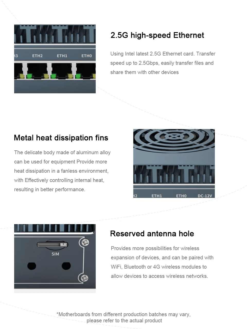 Equipado con 4 chips Intel i226, que proporcionan hasta 2,5 Gbps de ancho de banda de red, adecuado para escenarios de aplicaciones con altos requisitos de transferencia de datos, mejorando el rendimiento de la red.