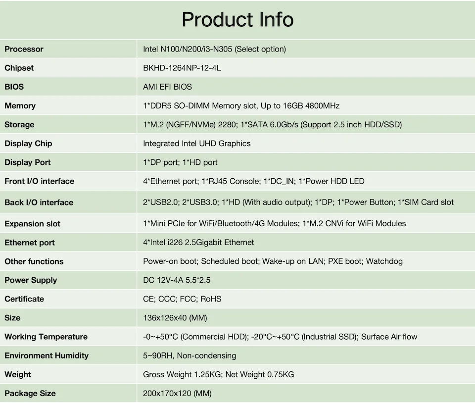 Equipado con procesador Intel N100, 4 núcleos y 4 hilos, la CPU TDP es de solo 6W, proporcionando capacidades informáticas de alto rendimiento y bajo consumo, adecuadas para diversas tareas informáticas integradas y ligeras.