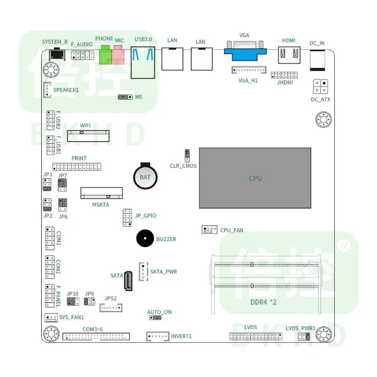Salida de vídeo: Proporciona 1 interfaz HD y 1 interfaz VGA. A Bordo de 1 eDP o LVDS (elija uno), admite pantalla triple síncrona/asíncrona, adecuada para varios requisitos de visualización. Adecuado para pantallas comerciales, pantallas táctiles y otros escenarios, proporcionando una calidad de salida de alta definición.
