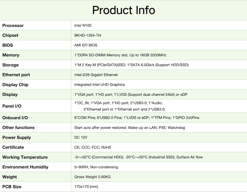 Procesador:El procesador Intel N100 de 4 núcleos y 4 hilos incorporado proporciona una amplia potencia informática. La potencia de diseño térmico (TDP) DE LA CPU es de solo 6W, adecuada para un funcionamiento a largo plazo de 7x24 horas.