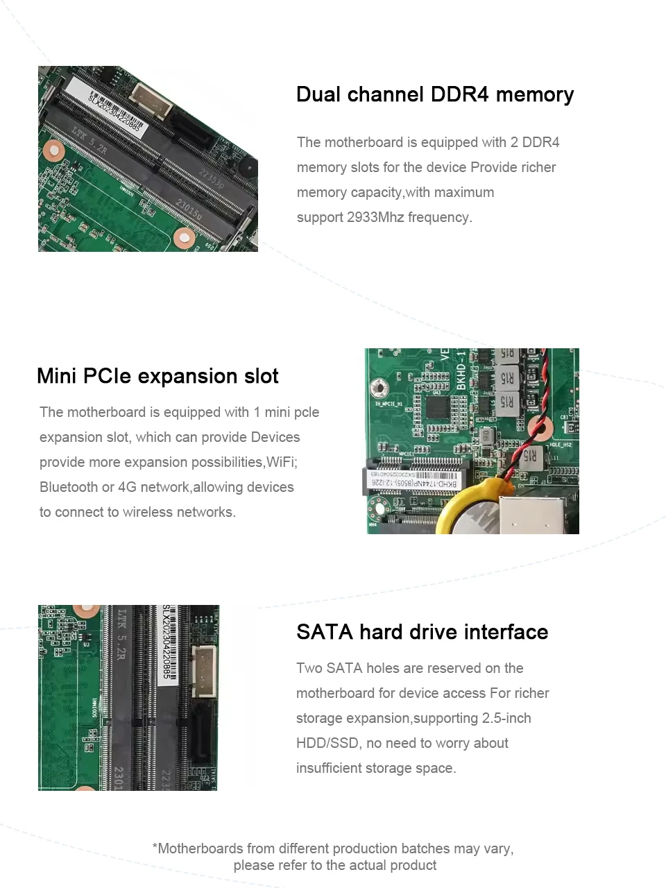 Admite hasta 64 GB de memoria SO-DIMM DDR4 de doble canal, proporcionando suficiente ancho de banda y rendimiento de memoria, adecuado para escenarios de aplicaciones multitarea y de alto ancho de banda.