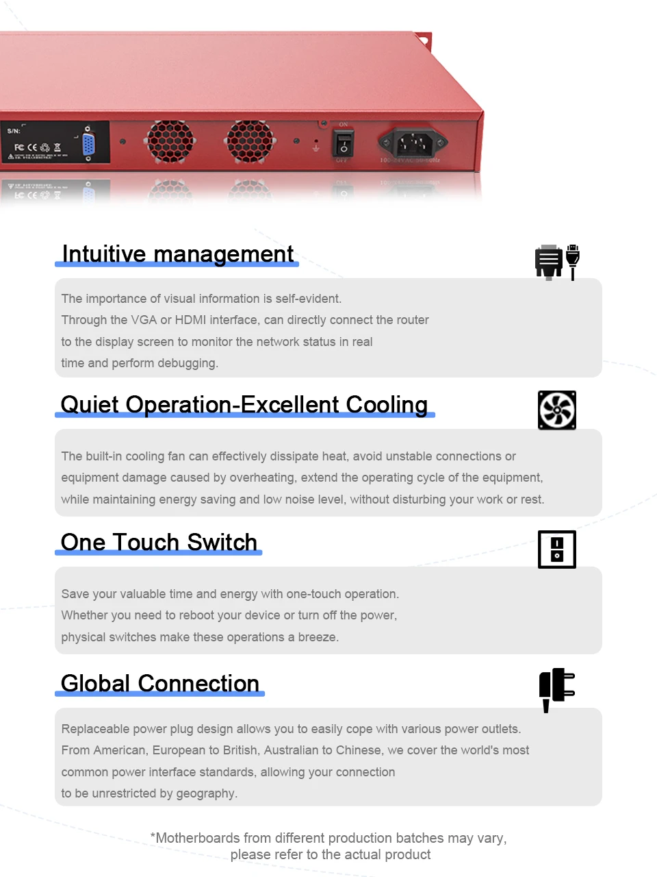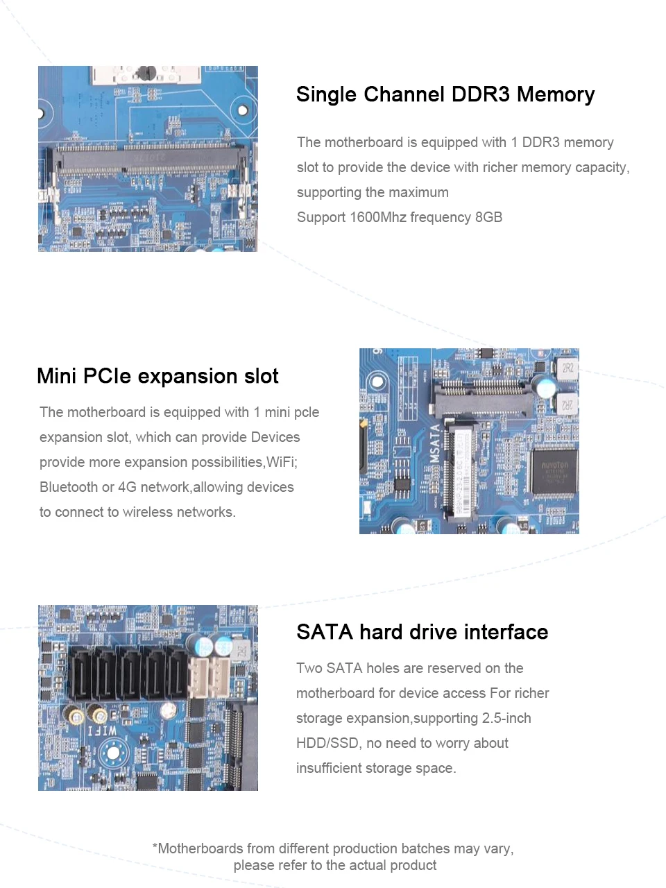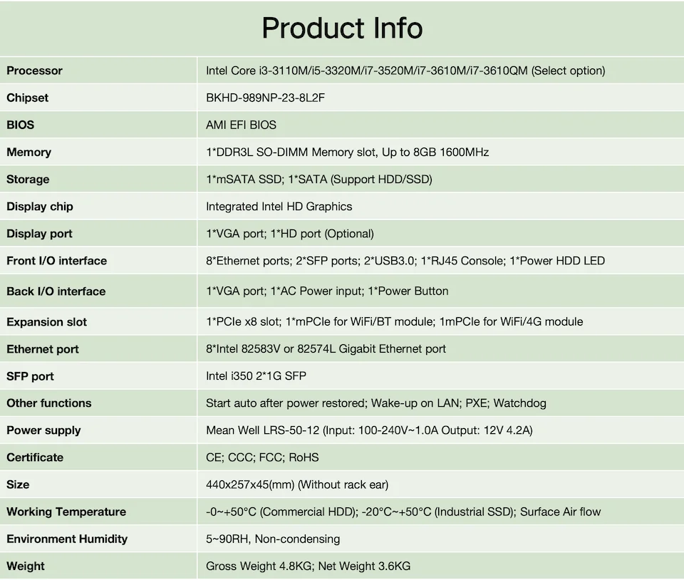 Equipado con 8 puertos Intel Gigabit Ethernet y 2 puertos Intel i350 Gigabit SFP de fibra, es adecuado para escenarios de aplicaciones que requieren conectividad de fibra y ofrece una mayor estabilidad y soporte de ancho de banda. Ofrece 1 ranura DDR3L SODIMM que admite una capacidad de memoria máxima de 8GB para cumplir con los requisitos de memoria de las aplicaciones de red generales. 1 interfaz mSATA para un almacenamiento rápido de estado sólido. 1 interfaz SATA, adecuada para discos duros mecánicos o SSD, para opciones de almacenamiento flexibles
