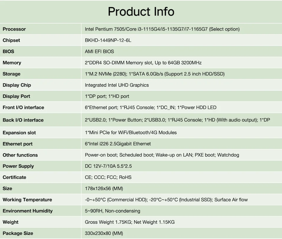 Mini host de alto rendimiento, silencioso pero potente.El BKHD G31F 1449 6L es un mini host de alto rendimiento en un chasis pequeño. Cuenta con procesadores Intel Pentium y Core de 11. ª generación incorporados, equipados con memoria DDR4 de doble canal y admite hasta 64GB. Ofrece un excelente rendimiento informático y capacidades multitarea, proporcionando una base técnica sólida para su negocio.Conectividad de red rápida y resistente: el diseño del puerto Ethernet 6x2,5G puede satisfacer las necesidades de múltiples dispositivos en línea simultáneamente, asegurando un funcionamiento de red suave y estable. Ya se trate de juegos en línea de alta velocidad en redes domésticas, reproducción de vídeo de alta definición sin problemas o transferencia de datos de alta velocidad y gestión de red en redes empresariales, este host puede ofrecer una experiencia de red superior.Diseño de ventilador silencioso para la disipación del calor: un ventilador silencioso con control de temperatura está instalado en la parte superior, que puede controlar eficazmente la temperatura de la unidad y mejorar la estabilidad y fiabilidad de la unidad. Este diseño no solo garantiza la estabilidad del rendimiento general de la unidad, sino que también crea un entorno de trabajo silencioso y cómodo para los usuarios.Especificaciones del producto: