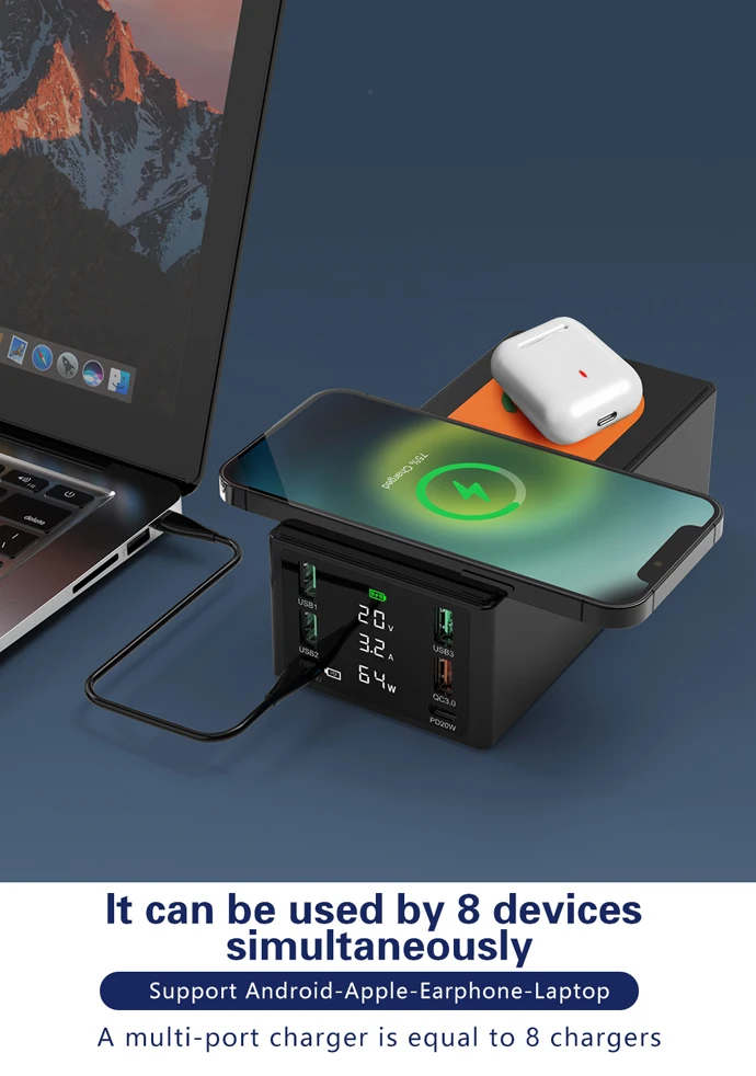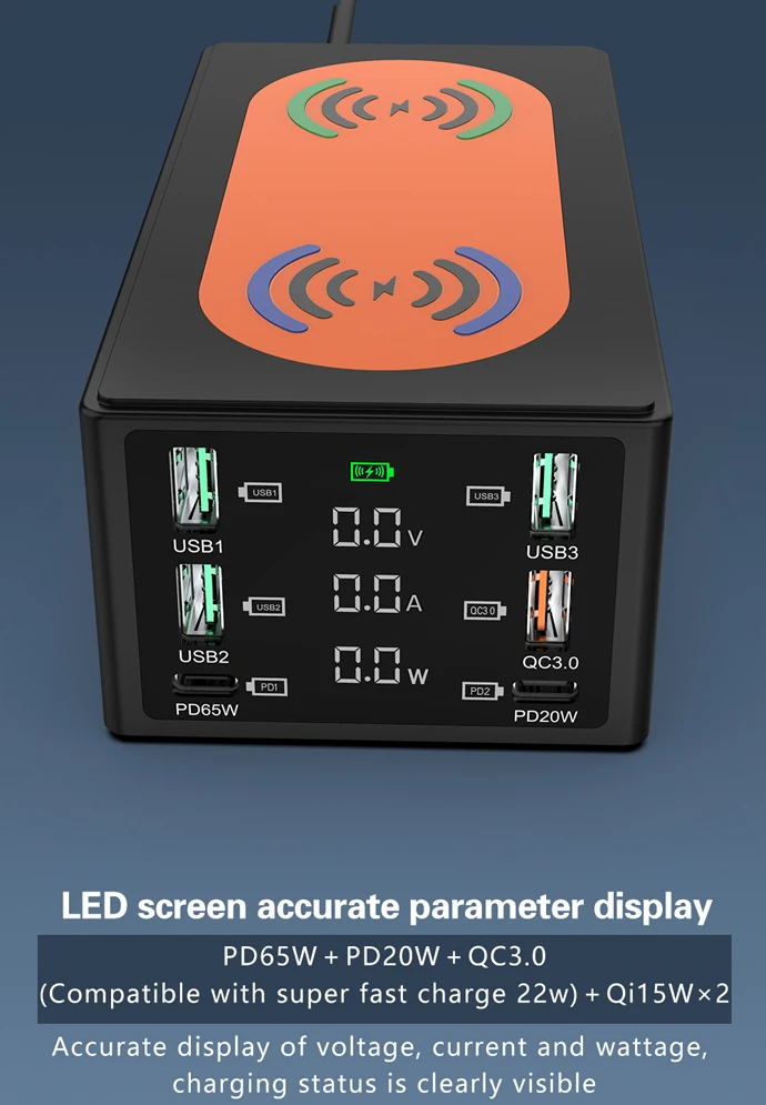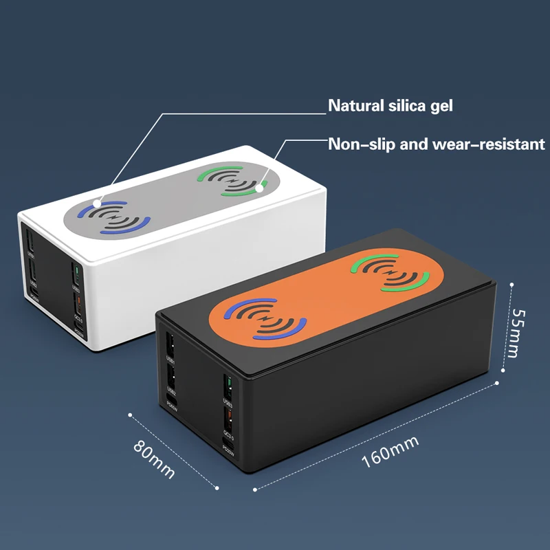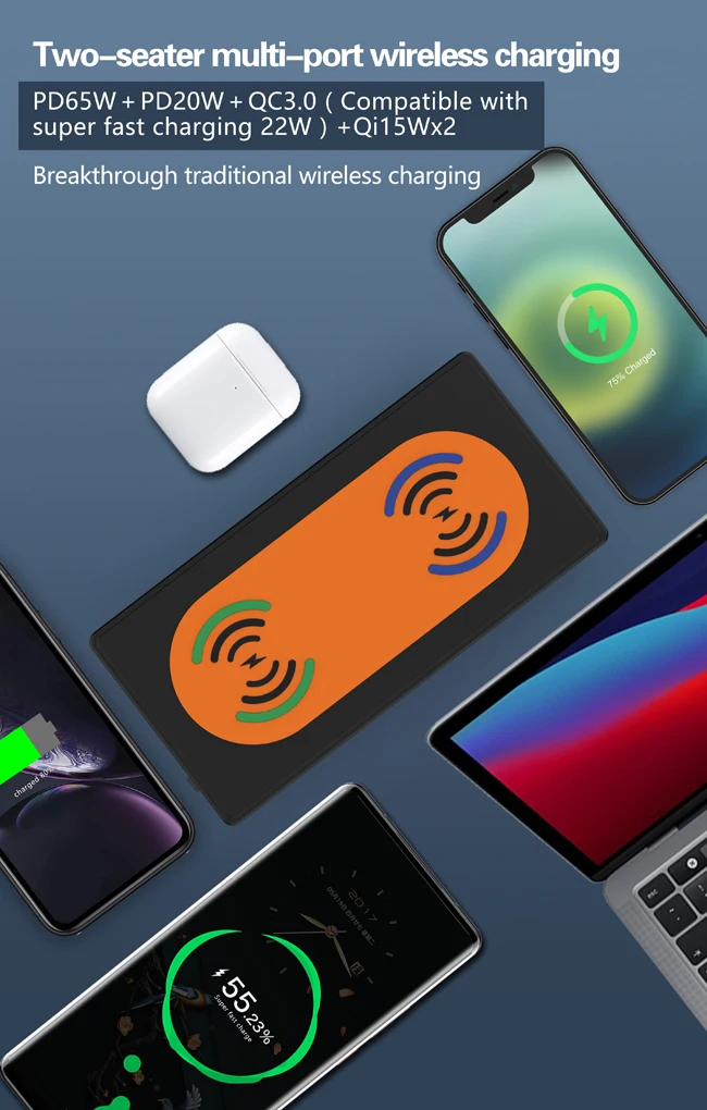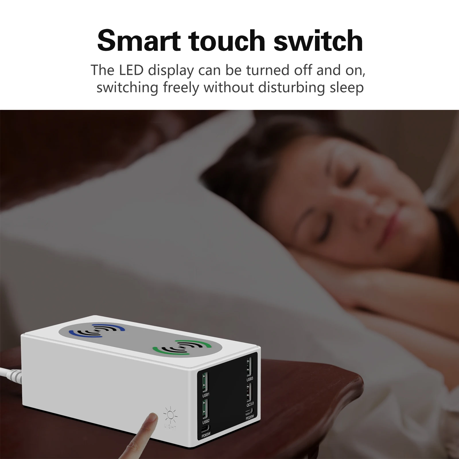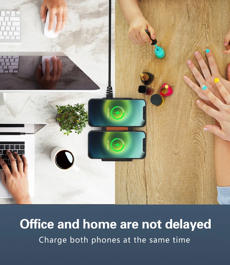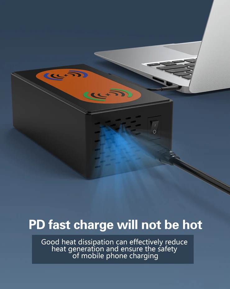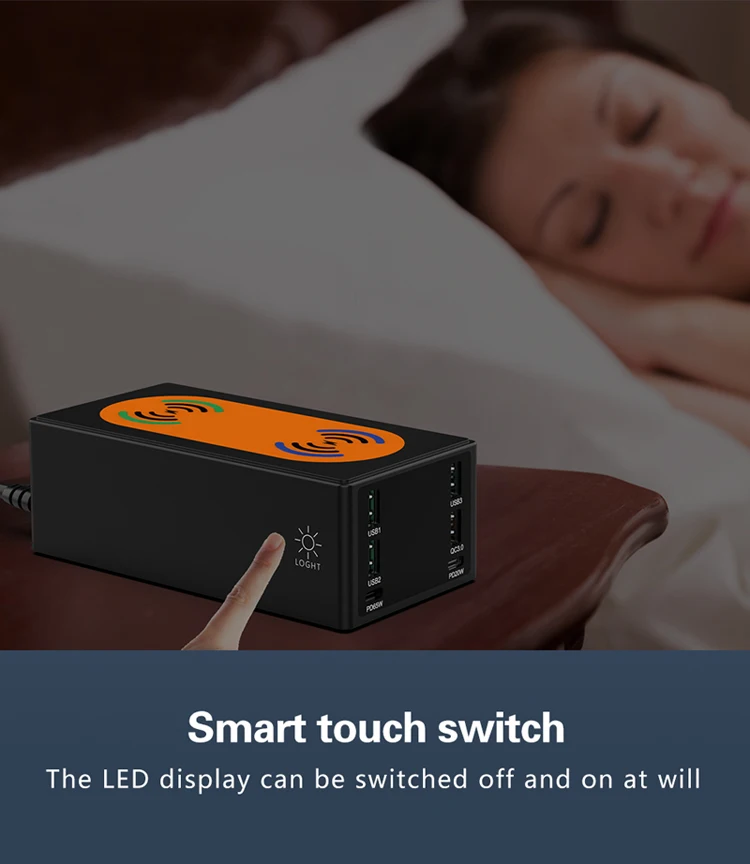 5. Equipado con 2 puertos de carga inalámbricos QI de 15W, y todos los puertos admiten carga rápida cuando todos los puertos se usan al mismo tiempo.