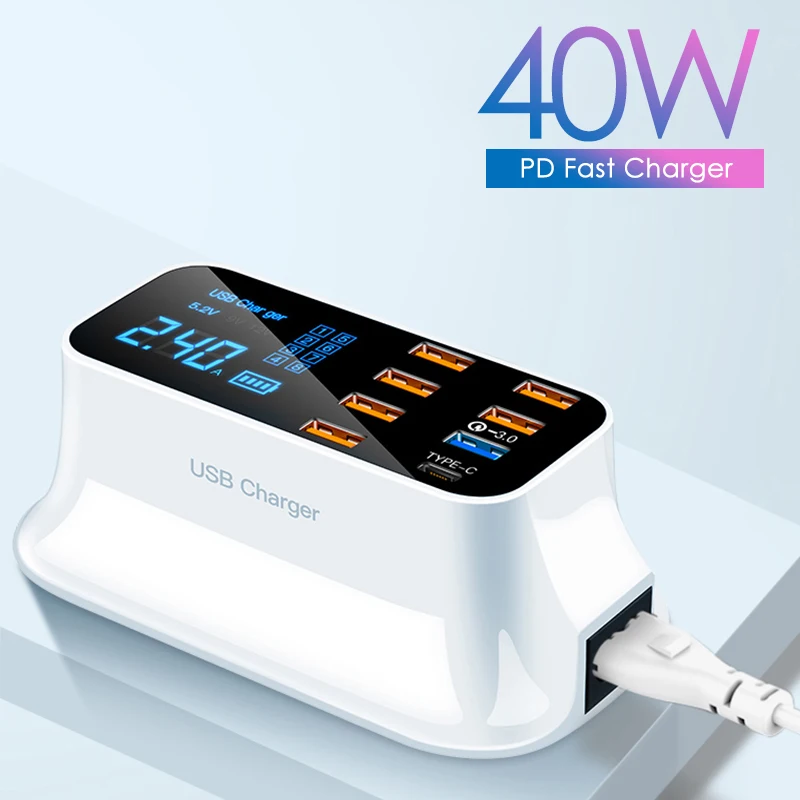 Comprar ILEPO-cargador de teléfono USB QC3.0 de 40W, cargador rápido tipo C con 8 puertos, pantalla Digital, estación de carga portátil de pared para viaje
