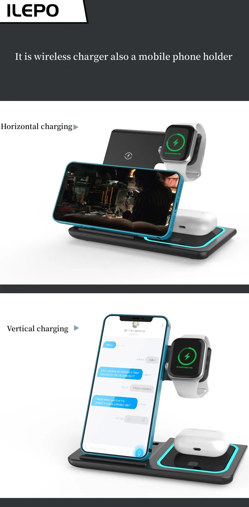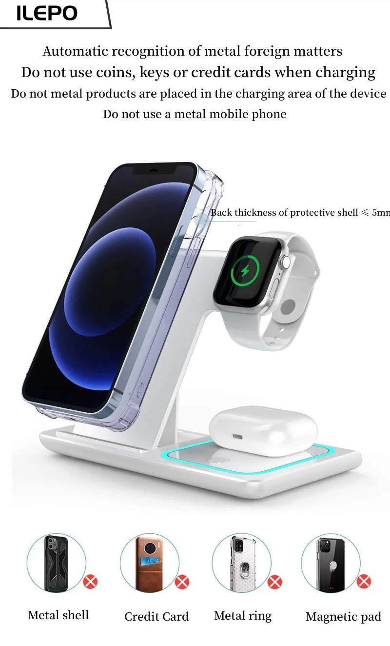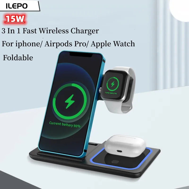 Soporte de cargador inalámbrico ILEPO 15W 3 en 1 para iPhone 13 12 11 Apple Watch Airpods Pro estación de carga rápida plegable