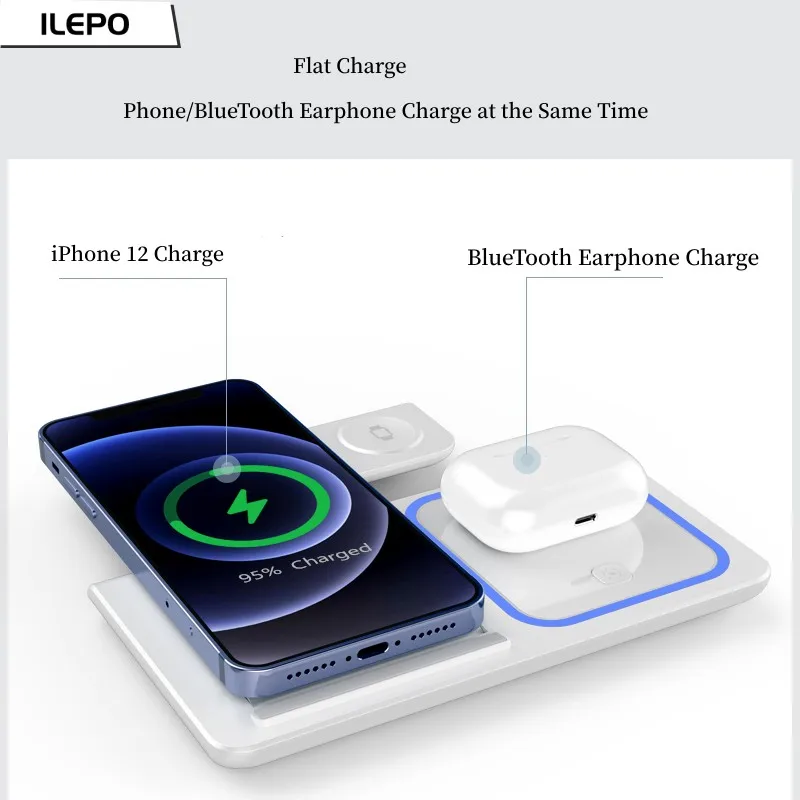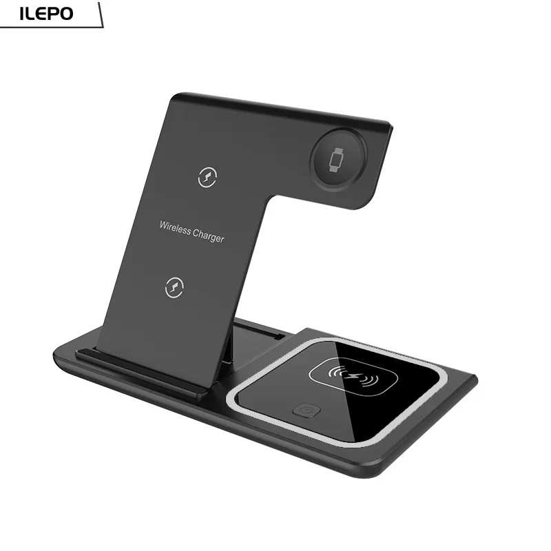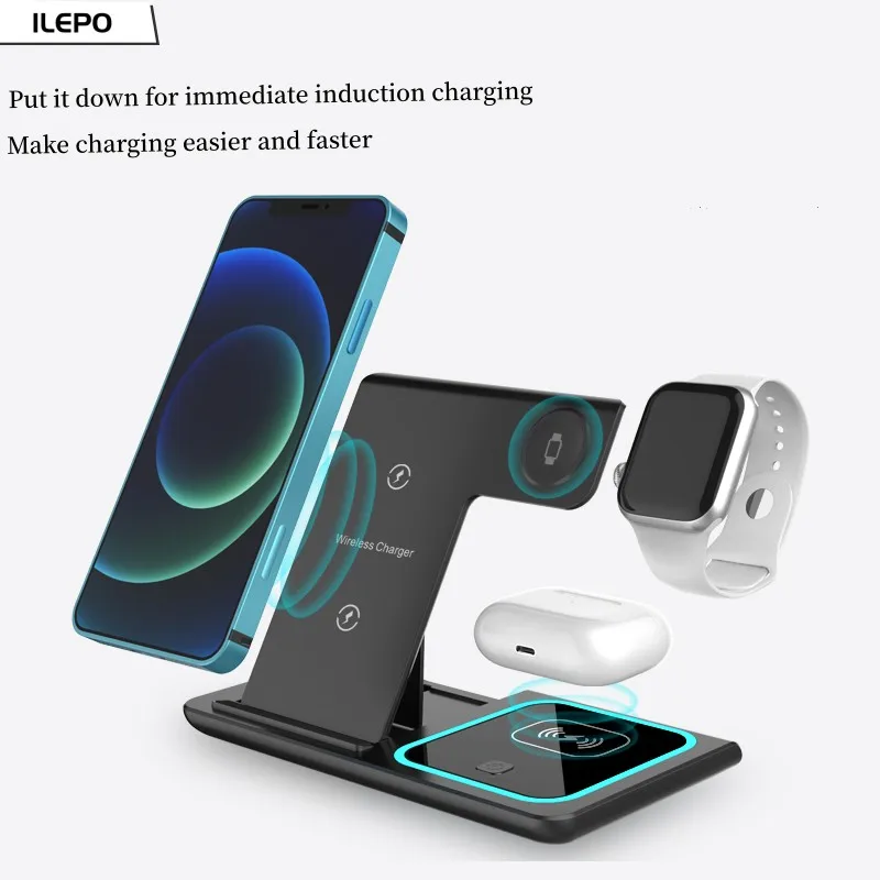 Soporte de cargador inalámbrico ILEPO 15W 3 en 1 para iPhone 13 12 11 Apple Watch Airpods Pro estación de carga rápida plegable