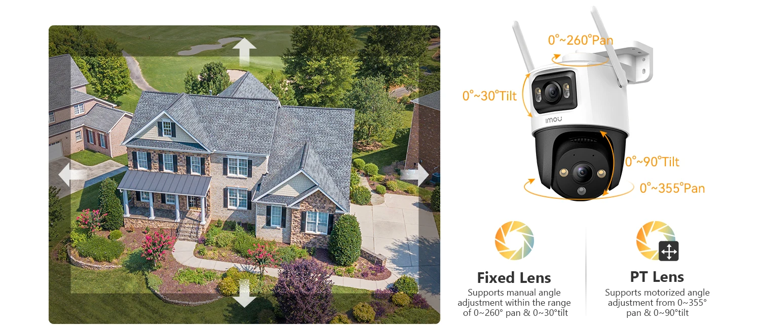 • Lente dual con cámara dual 8MP/10MP:La Cámara IP IMOU Cruiser cuenta con un diseño de doble lente con cámaras duales de 8MP/10MP, proporcionando imágenes de alta definición para una vigilancia de seguridad superior.