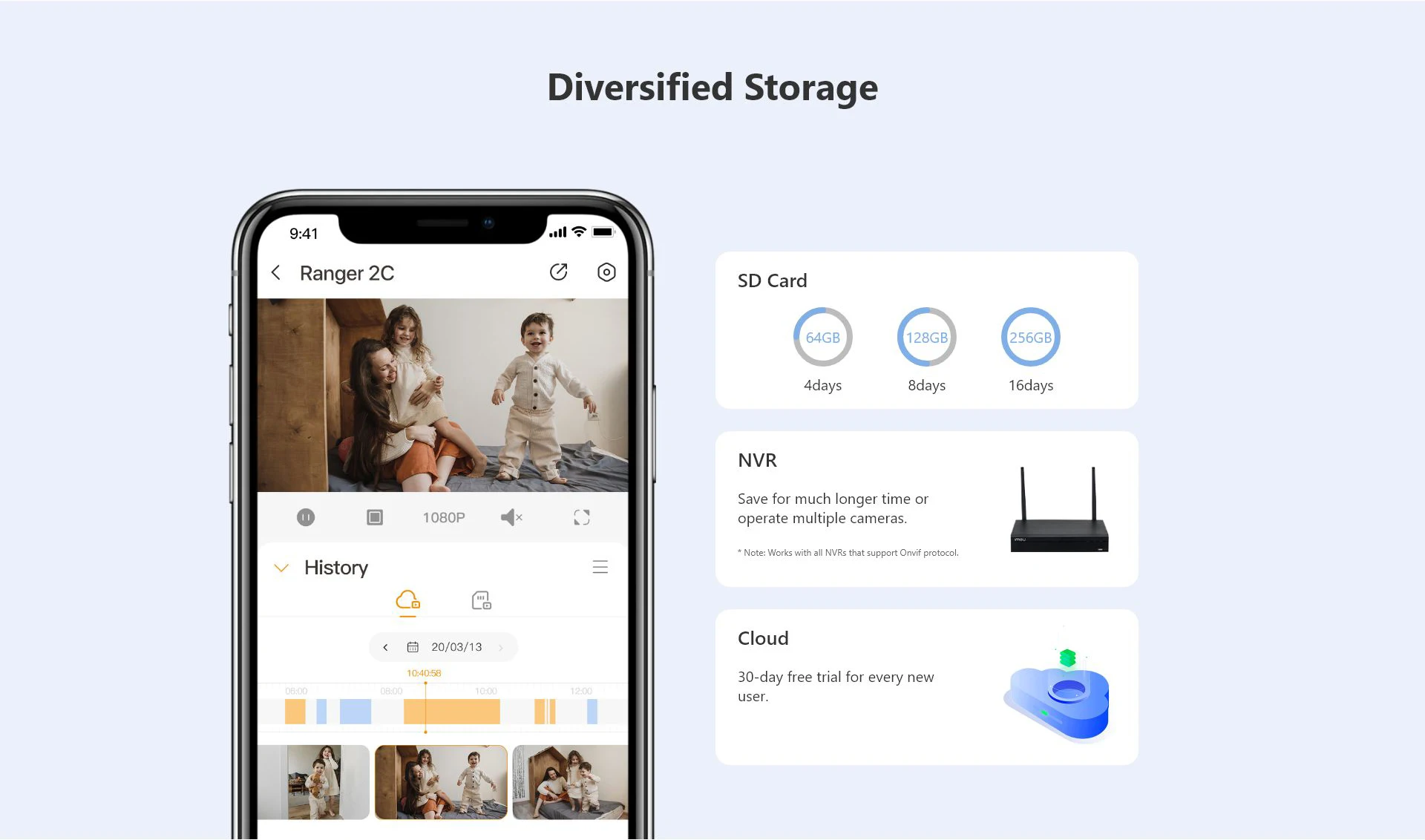 El video se almacena y se accede fácilmente a través de la tarjeta SD, NVR o Cloud Storage.
