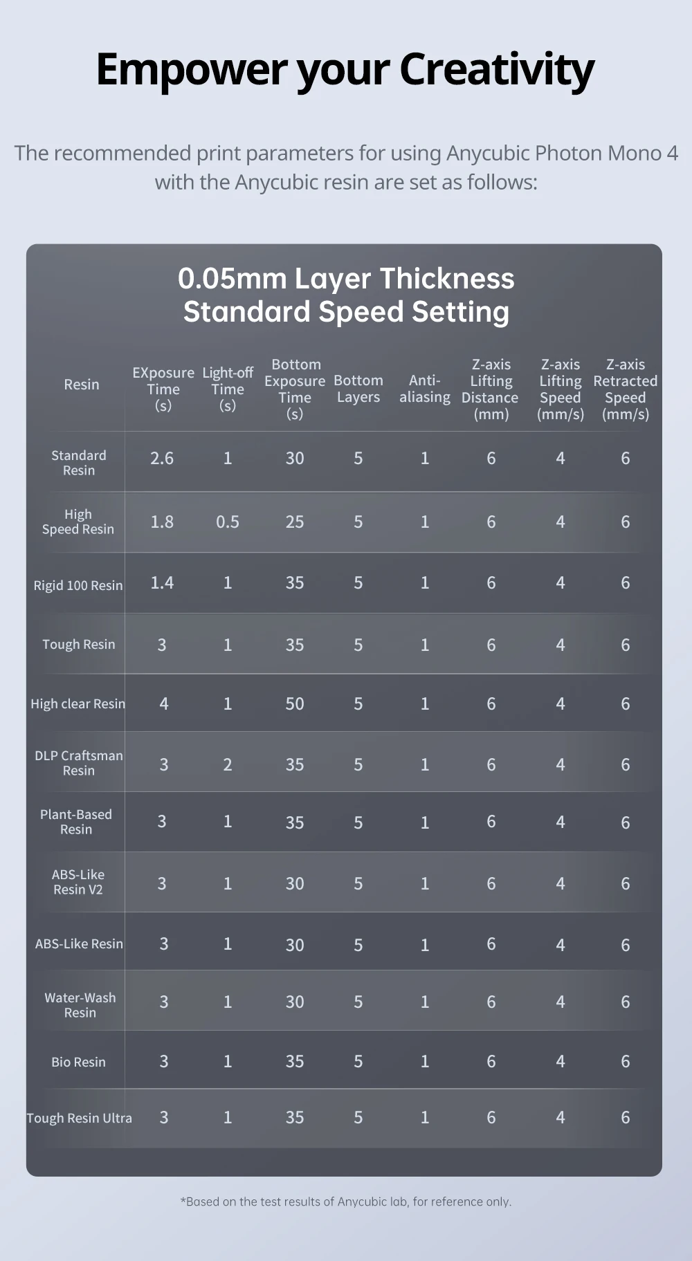 (*Basado en los resultados de las pruebas del laboratorio Anycubic, solo como referencia).