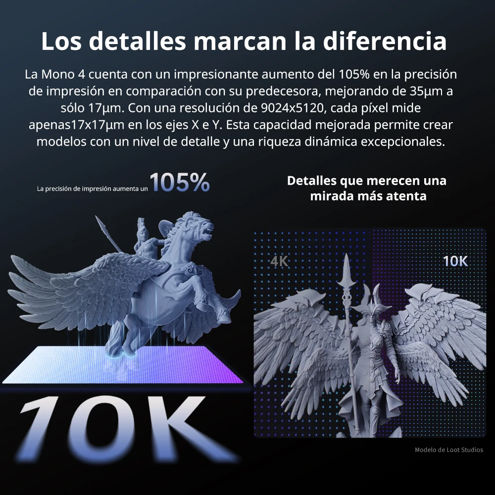 El Mono 4 AE Vesion cuenta con un impresionante aumento del 105% en la precisión de impresión en comparación con su predecesor, mejorando de 35 μm a solo 17 μm.Con una resolución de 9024x5120, cada píxel mide solo 17x17μm en los ejes X e Y.Esta capacidad mejorada permite crear modelos con detalles excepcionales y riqueza dinámica.