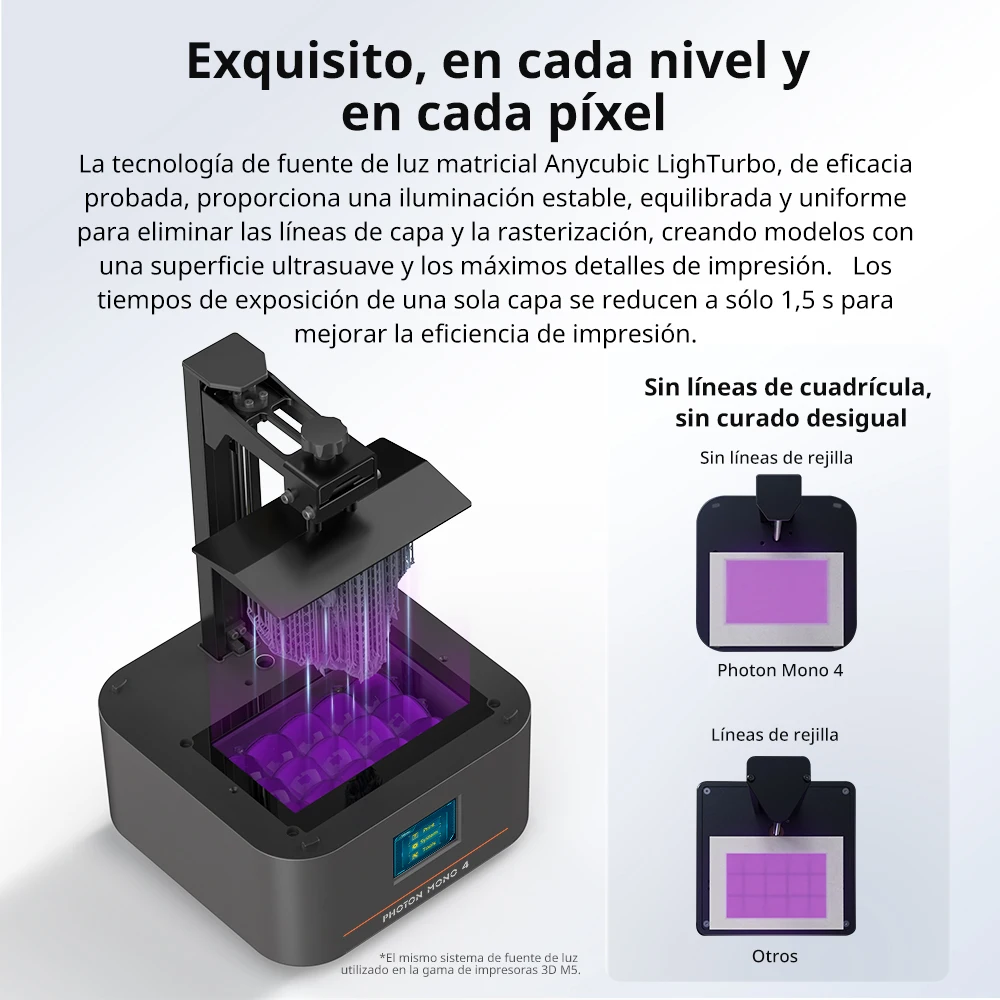 La tecnología de fuente de luz de matriz Anycubic LighTurbo probada por el tiempo proporciona una iluminación estable, equilibrada y uniforme para eliminar las líneas de capas y la rasterización, creando modelos con una superficie ultrasuave y máximos detalles de impresión.Los tiempos de exposición de una sola capa se reducen a solo 1,5 segundos para mejorar la eficiencia de la impresión.
