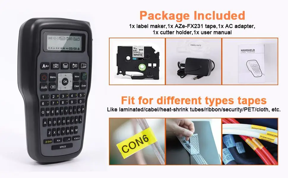 ④ 1 paquete de 12mm AZe-FX231 cinta de etiquetas: el etiquetador E1000 viene con 1 paquete AZe-FX231 cinta de etiquetas negro sobre blanco, fuerte adherencia y resistencia al agua, UV, aceite, desvanecimiento, abrasión, etc. Perfecto para aplicaciones en interiores y exteriores;