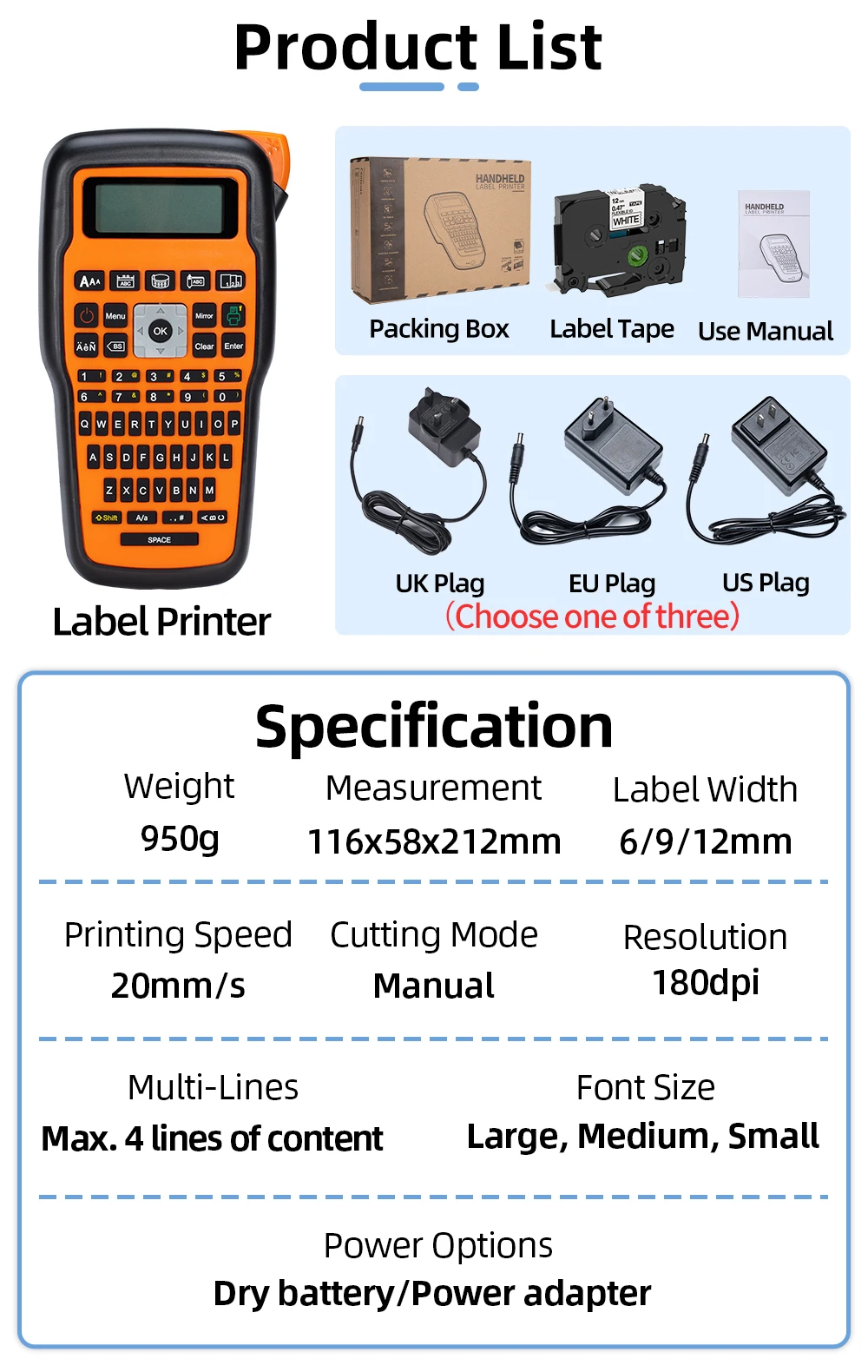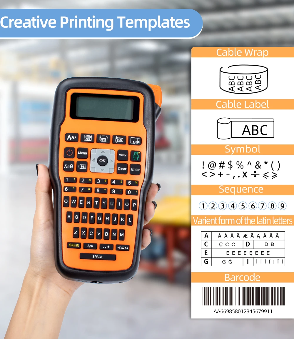 El etiquetador E1000 presenta un simpleTeclado Qwertypara un uso fácil y escritura rápida, las teclas inteligentes de un toque para llamar a las funciones de uso frecuente directamente en el teclado pueden satisfacer las necesidades de varios escenarios con funciones potentes.22 idiomas, más de 940 símbolos, 4 fotogramas, 3 etiquetas Margins, etc.