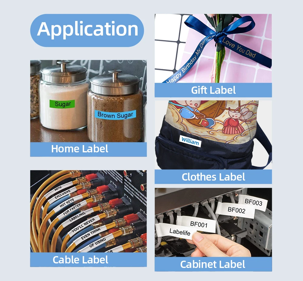 Máquina portátil para fabricar etiquetas:El etiquetador E1000 puede hacerle la vida de la organización mucho más fácil, lo que se puede utilizar paraorganizar el hogar, la oficina, el área industrial, la tienda, el almacén, el laboratorio, el jardín y otros.incluidos artículos personales, frascos, cocina, anteras, cables, áreas para mascotas, artículos para bebés, juguetes para niños, decoraciones navideñas, activos fijos de oficina, etc.