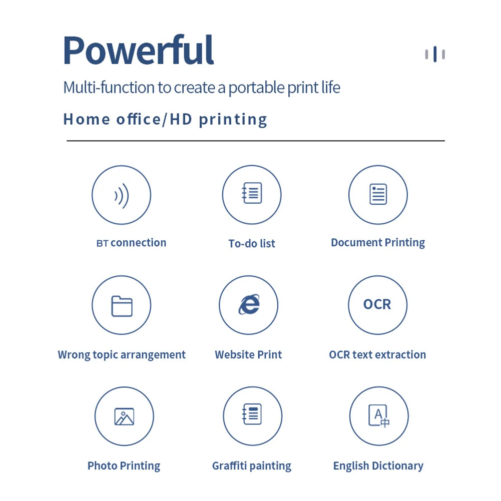 4. Impresión de alta calidad:Disfrute de impresiones de alta resolución con la impresora portátil inalámbrica, que no requiere reemplazo de piezas ni tinta. Ofrece velocidades de transferencia rápidas, bajo nivel de ruido, rendimiento estable y patrones de transferencia claros.