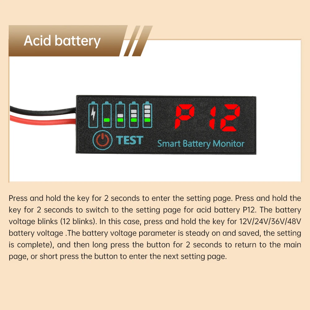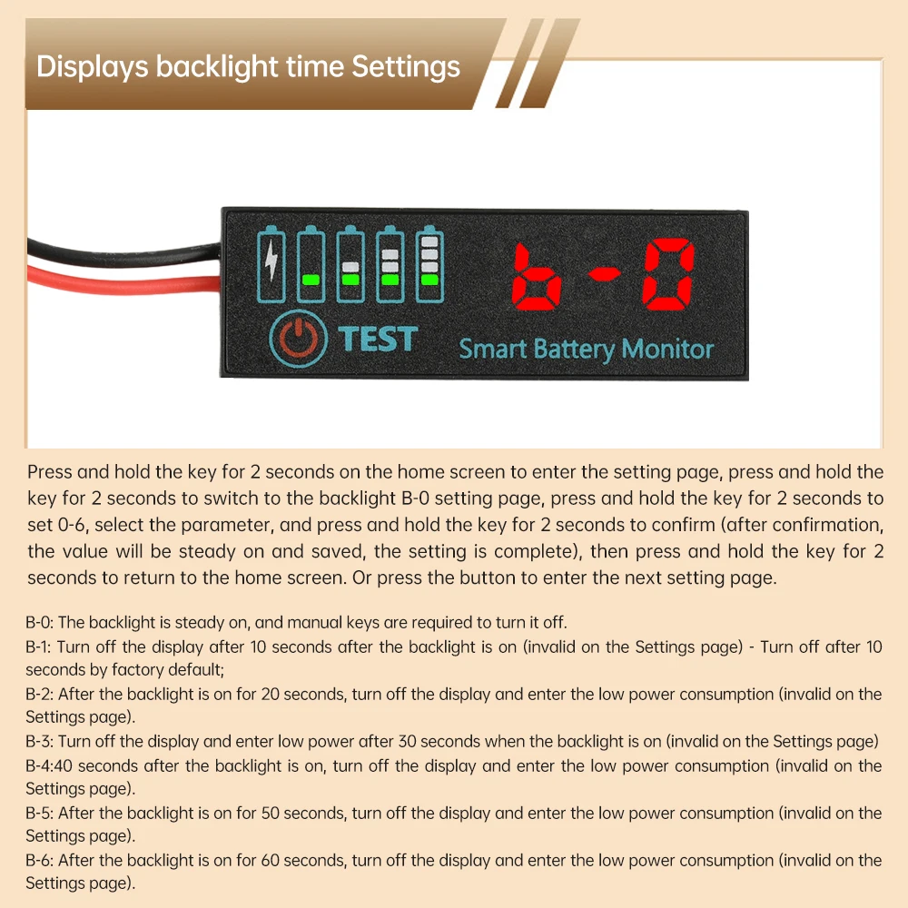 3.Configuración de tiempo de retroiluminación, ahorro de energía y protección del medio ambiente: la función de configuración de tiempo de retroiluminación de pantalla ajustable incorporada permite a los usuarios ajustar la duración de la retroiluminación de acuerdo con la luz ambiental y los hábitos personales, prolongando la vida útil de la placa indicadora de batería.